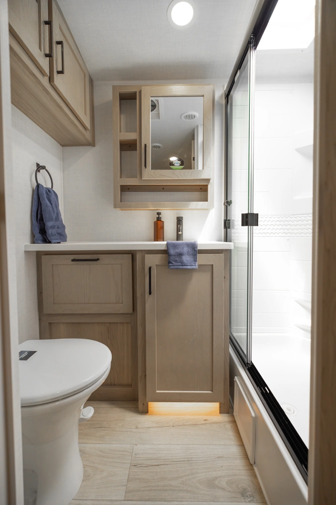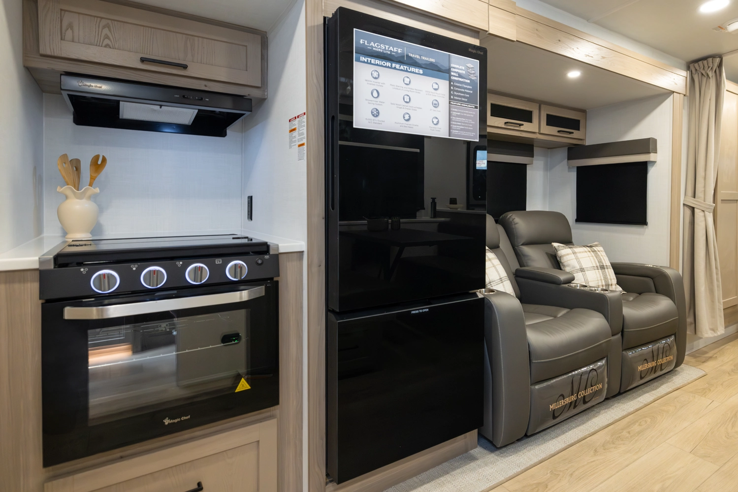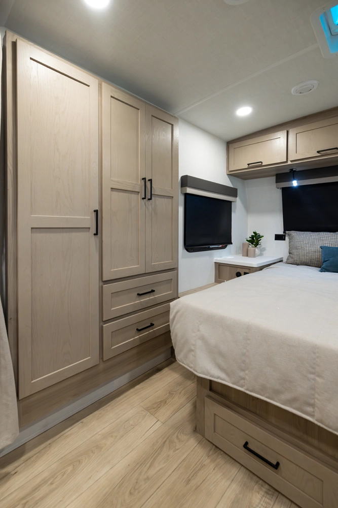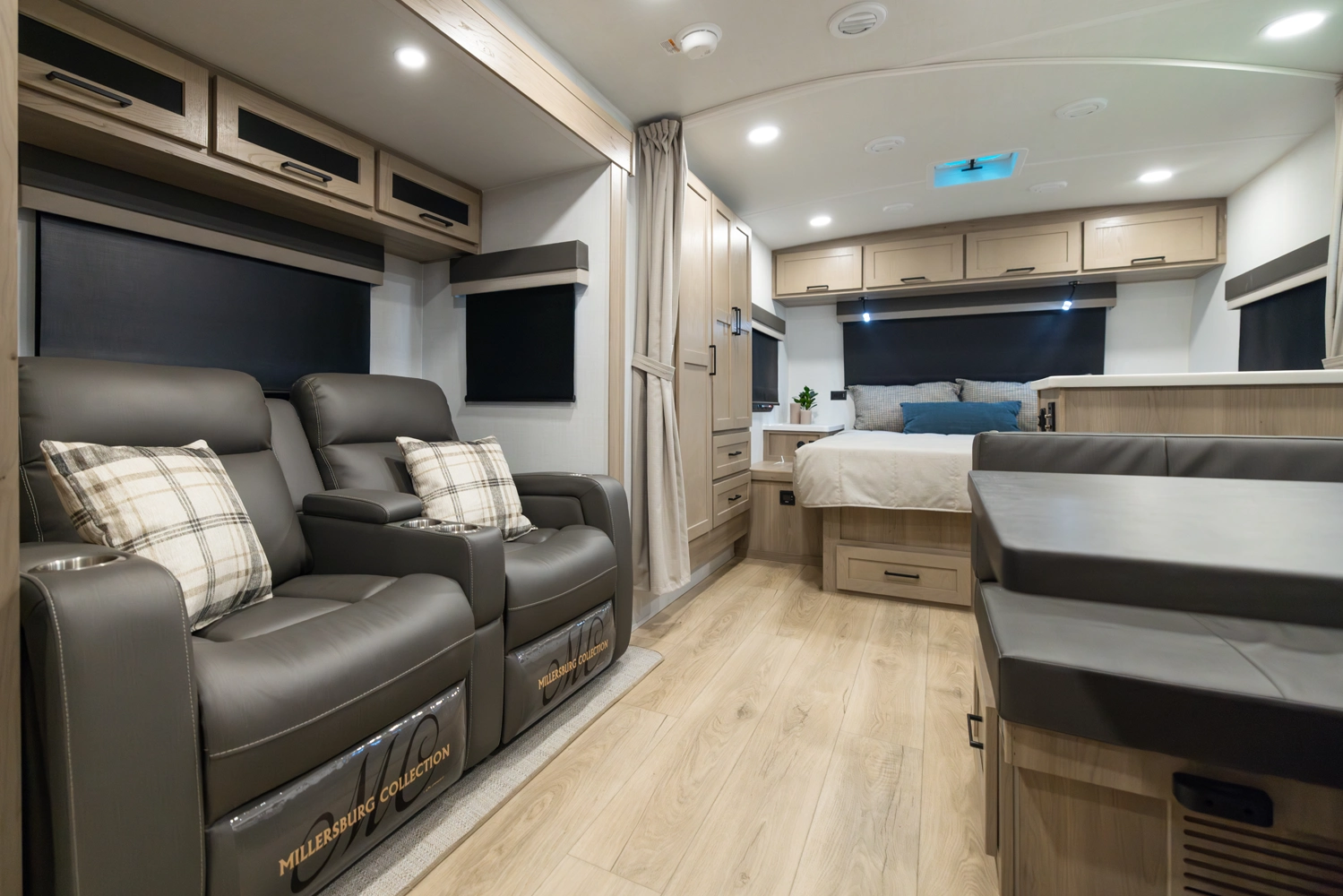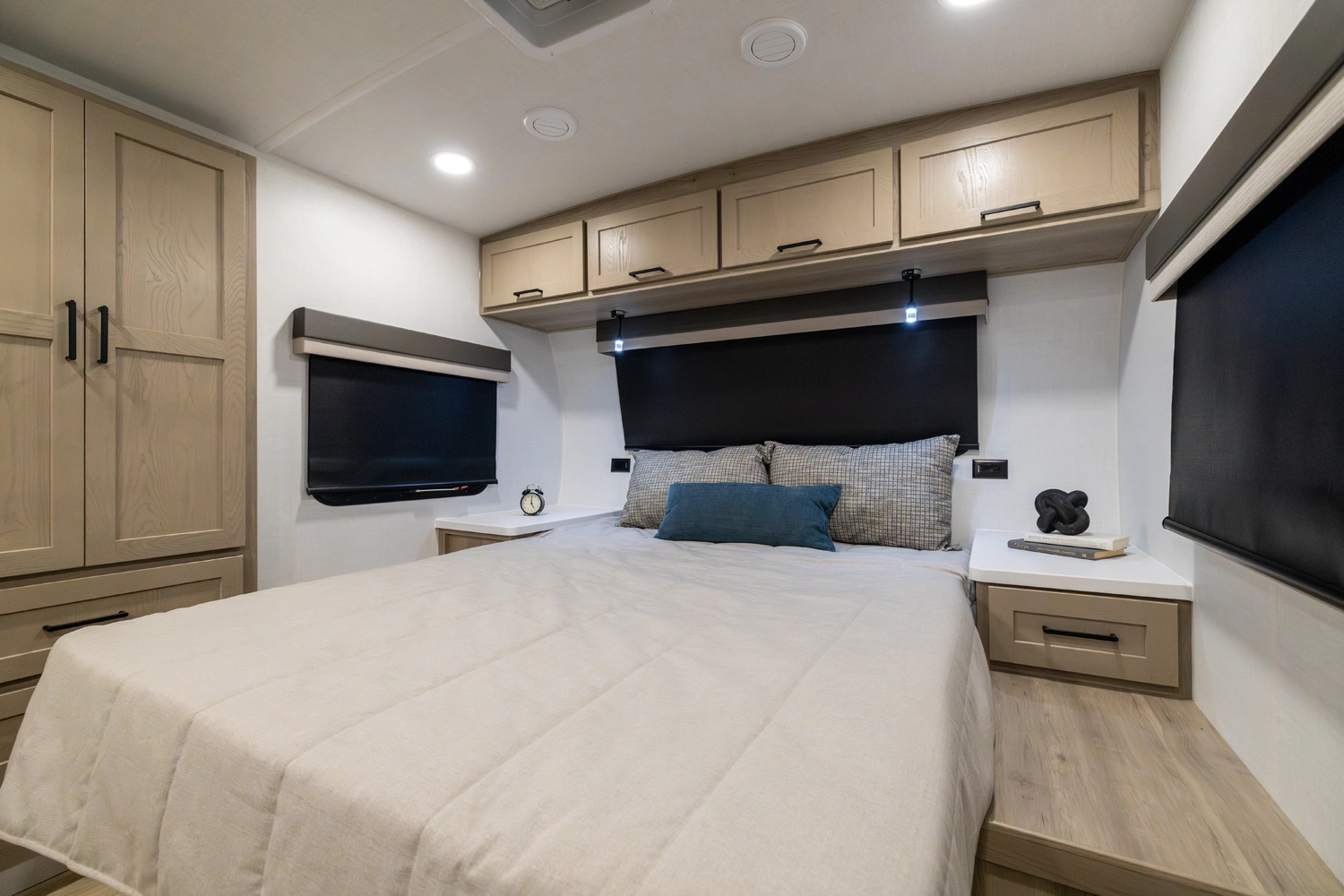 The 25FBD is a beautiful front bedroom floor plan featuring a unique wardrobe/pantry slideout for exceptional storage and organization. The living area includes theater seating directly across from the adjustable “televator” which raises for TV viewing and lowers so you can enjoy the massive door side window views. A versatile dinette and spacious rear kitchen with plenty of counter space completes the thoughtful design.