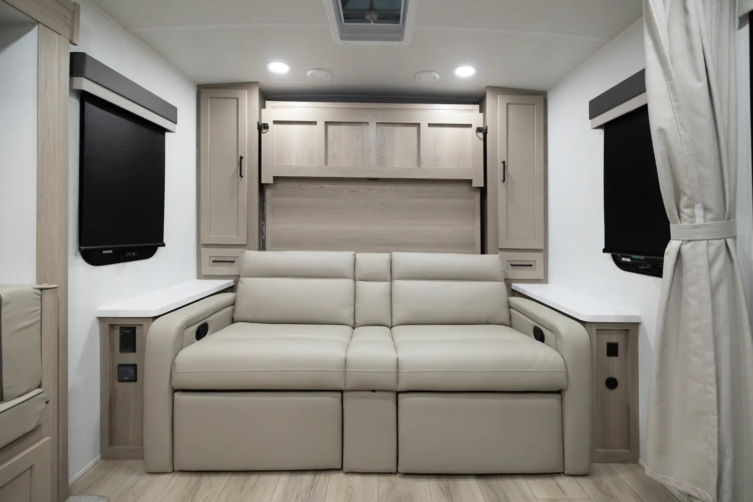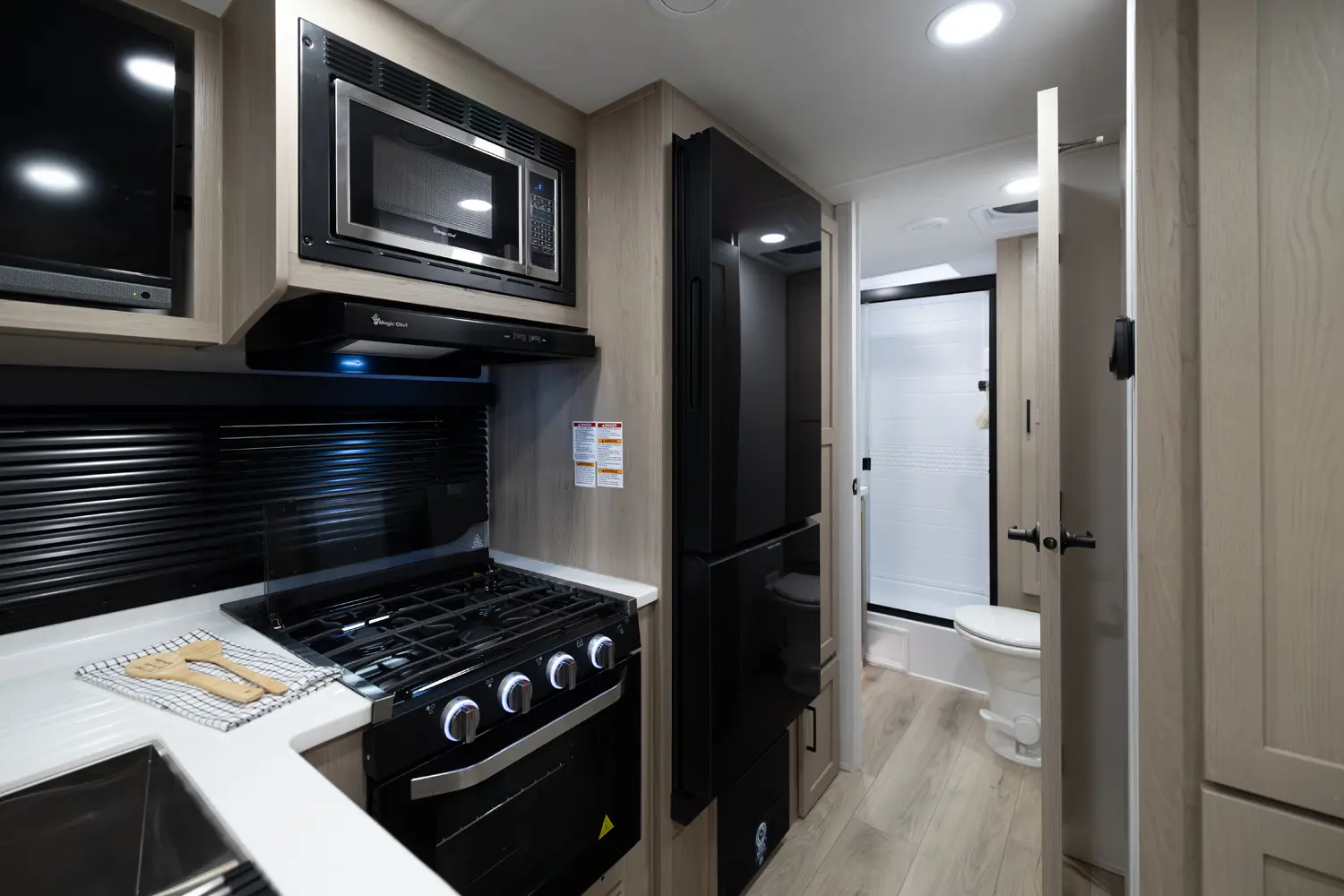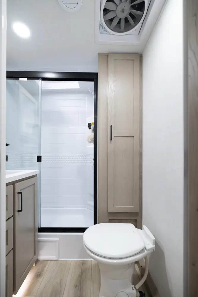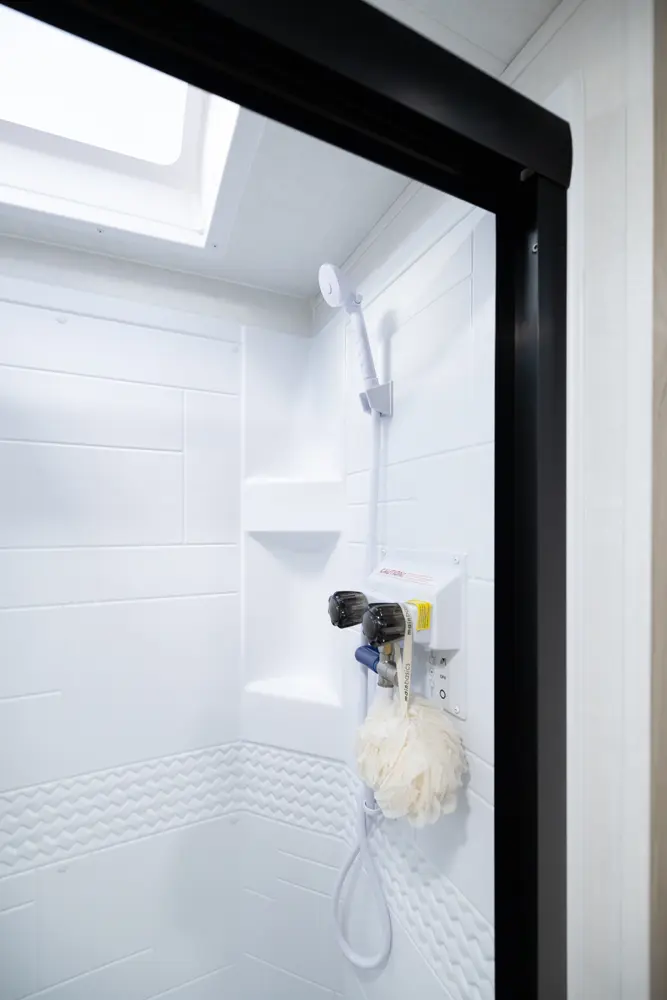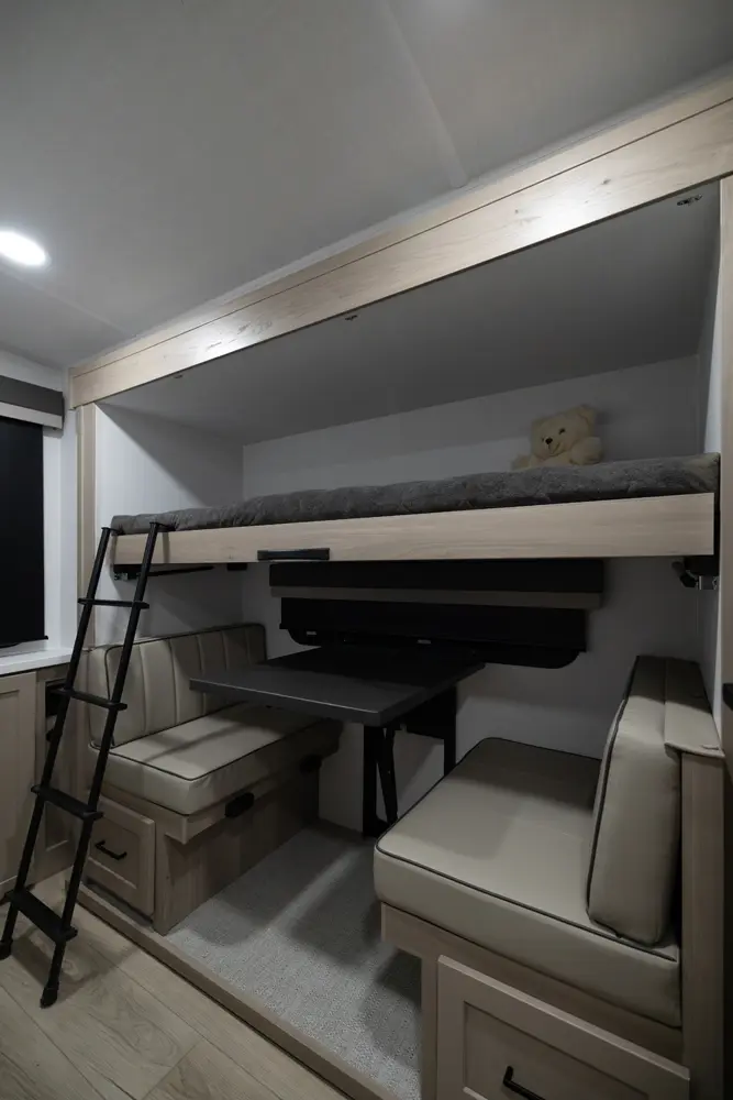 The 25FBH is built for comfort and family fun, featuring a private rear bunk room that gives kids (or guests) their own space. In the main area, you’ll find a massive U-shaped dinette perfect for meals and lounging, plus a front Murphy bed that easily converts to maximize living space. A large rectangular shower in the bathroom adds everyday convenience, making the 25FBH a great choice for families who want room to relax and recharge on every adventure.