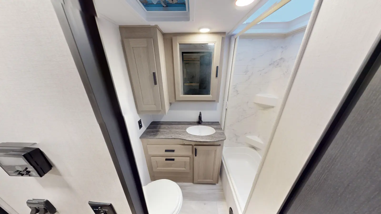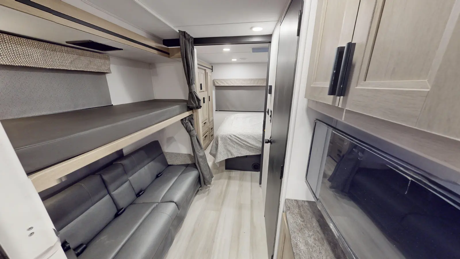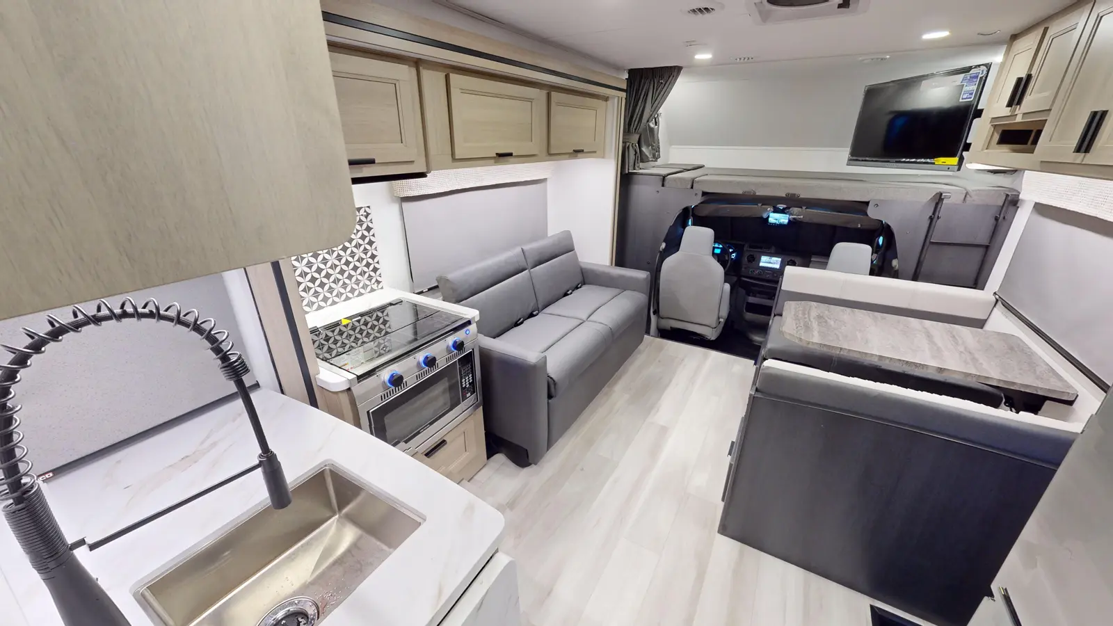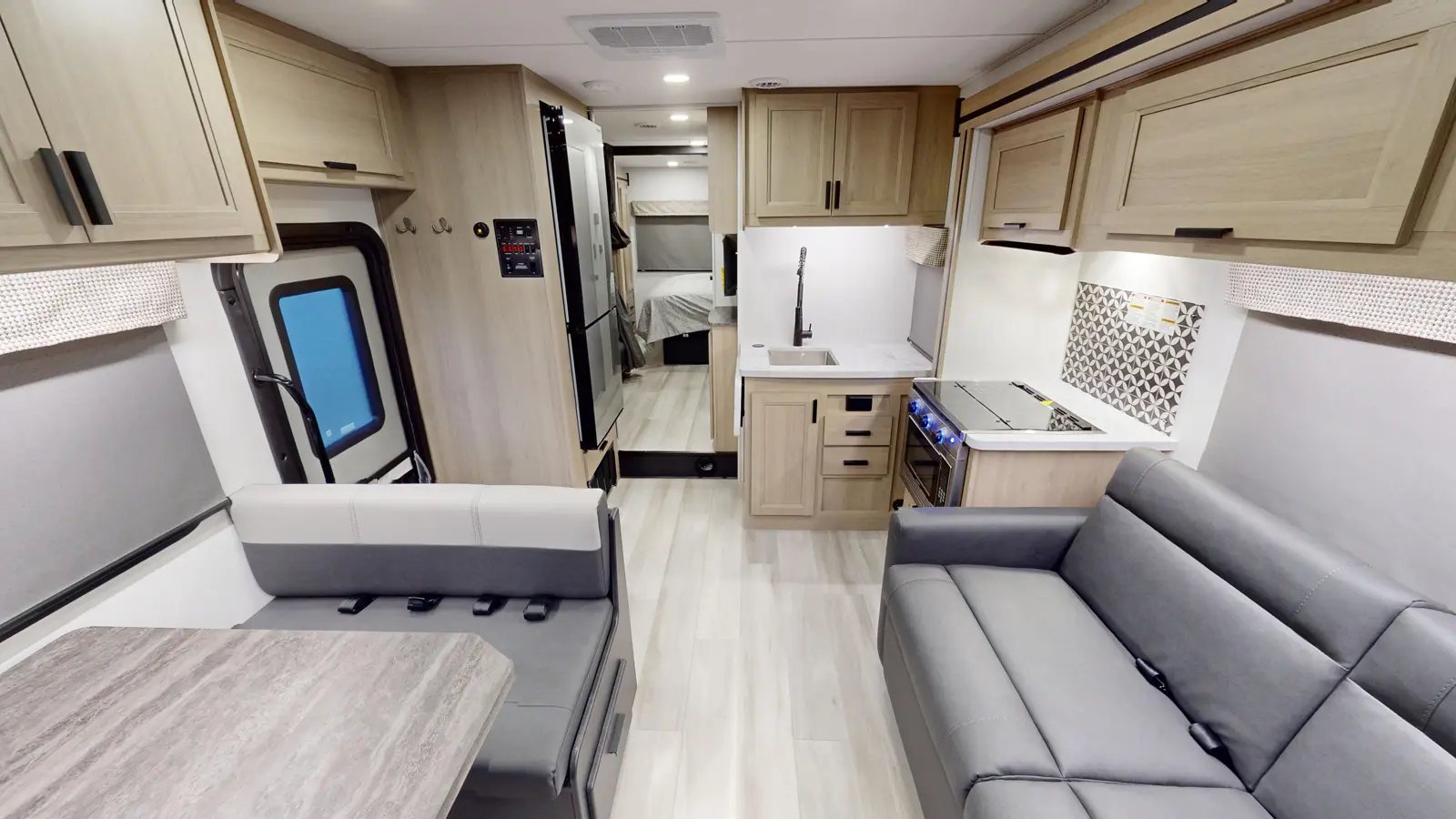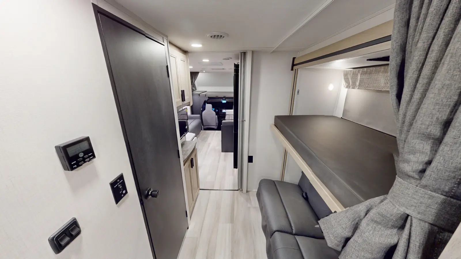 The Forester 3251SLE has a dedicated Kid Zone (fold down bunk, sofa sleeper, and entertainment center), private rear queen bedroom, and bunk over cab. The kitchen offers a convection microwave and recessed three-burner range. The refrigerator has plenty of room, and the U-shaped dinette is perfect for family dining. The bathroom has a 24" x 32" skylight shower, commode, sink, and medicine cabinet, plus storage cabinets just outside the door. This model is built on a Ford E450 chassis.