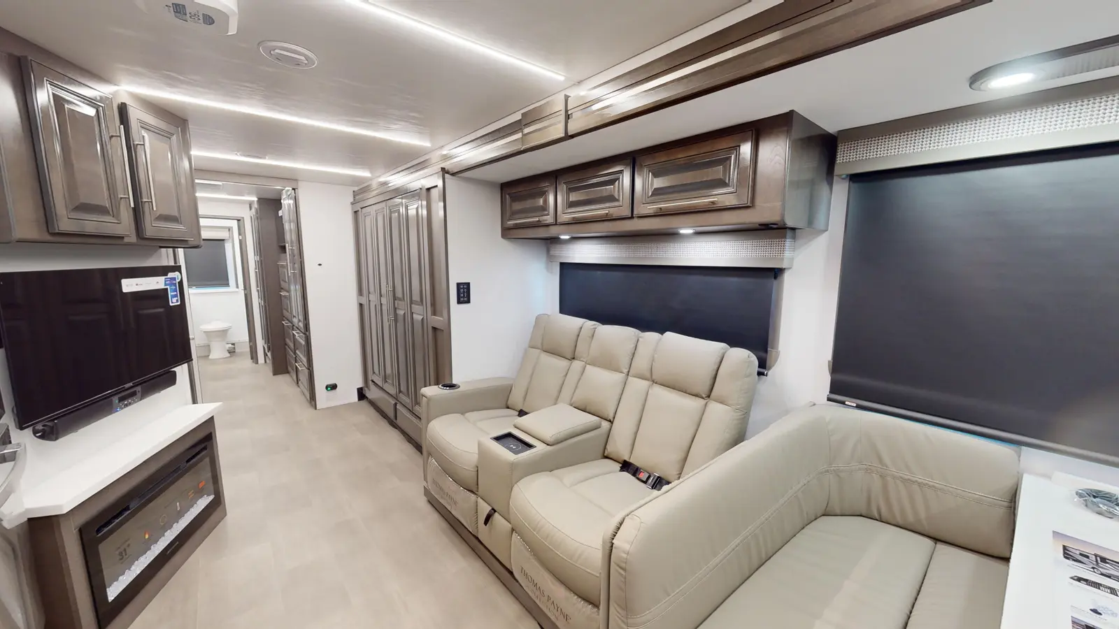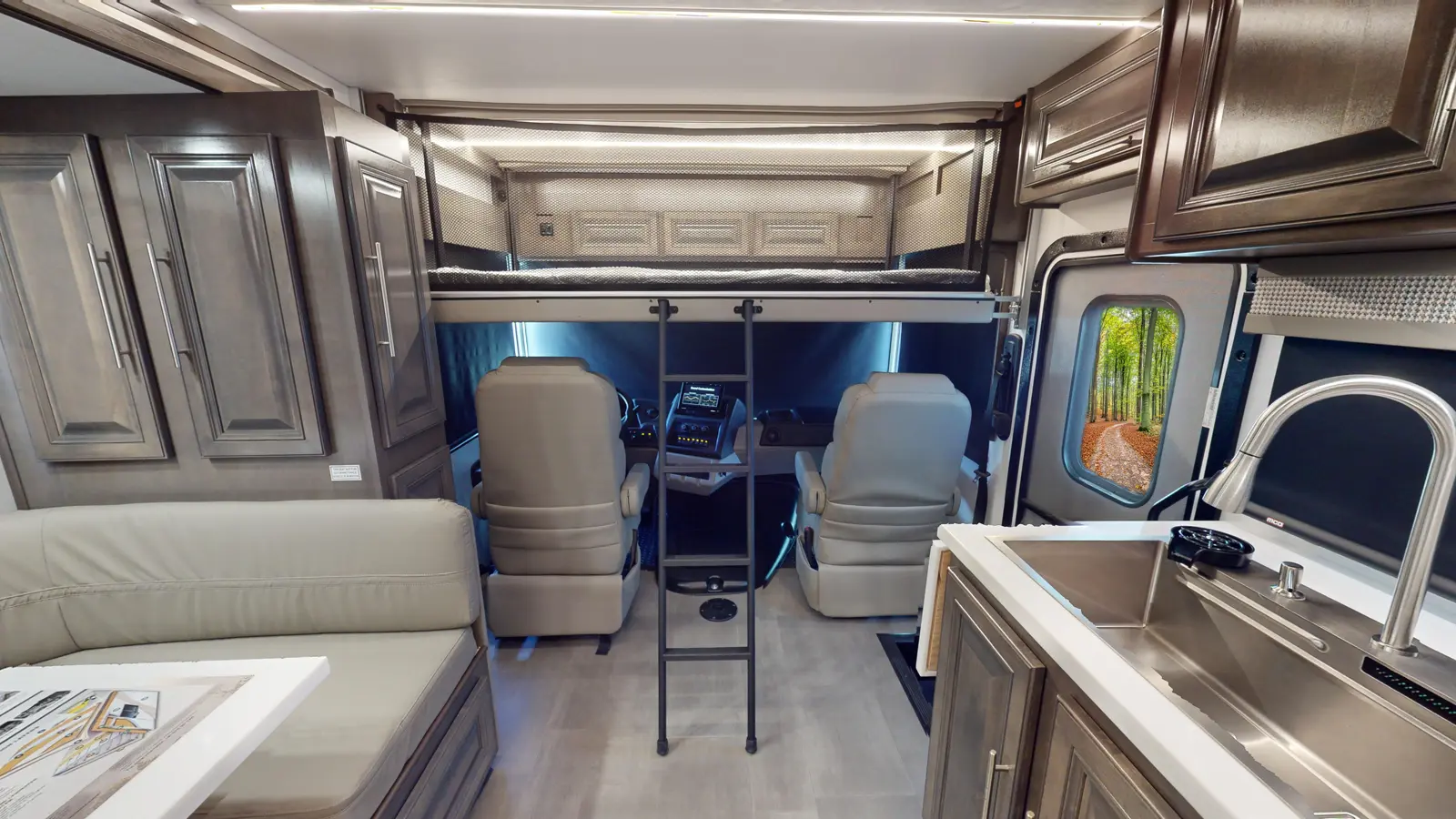 The Georgetown 36K7 by Forest River is designed for family comfort with two full baths and bunks. The kitchen features a farmhouse sink, 3-burner cooktop, microwave, and residential refrigerator. Enjoy entertainment in the theater seats across from a TV. The mid-ship full bath is across from the bunk beds. The bedroom offers a king bed and optional washer/dryer, plus a full master bath. The cab features swivel captain seats, a table, and a power overhead bunk.