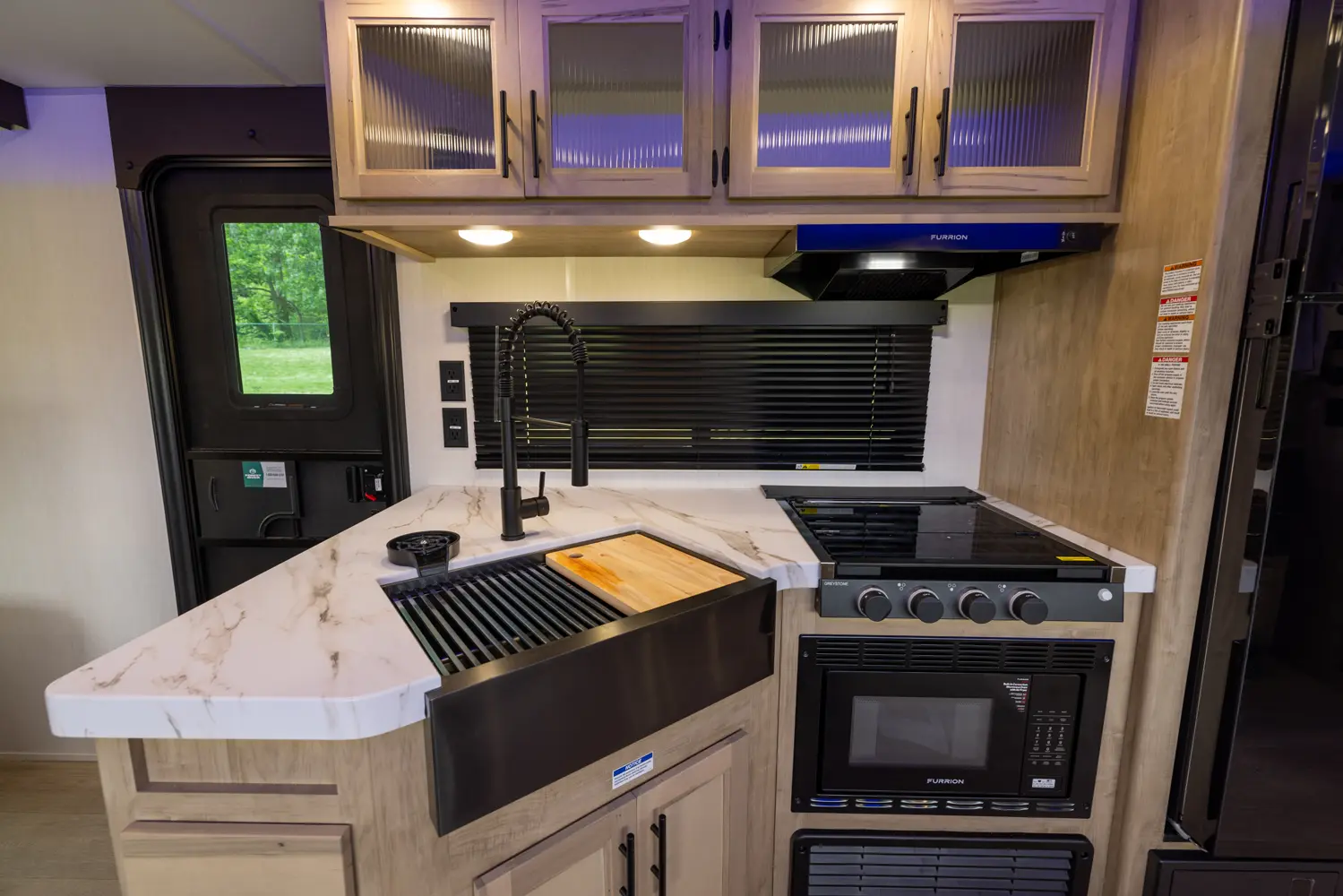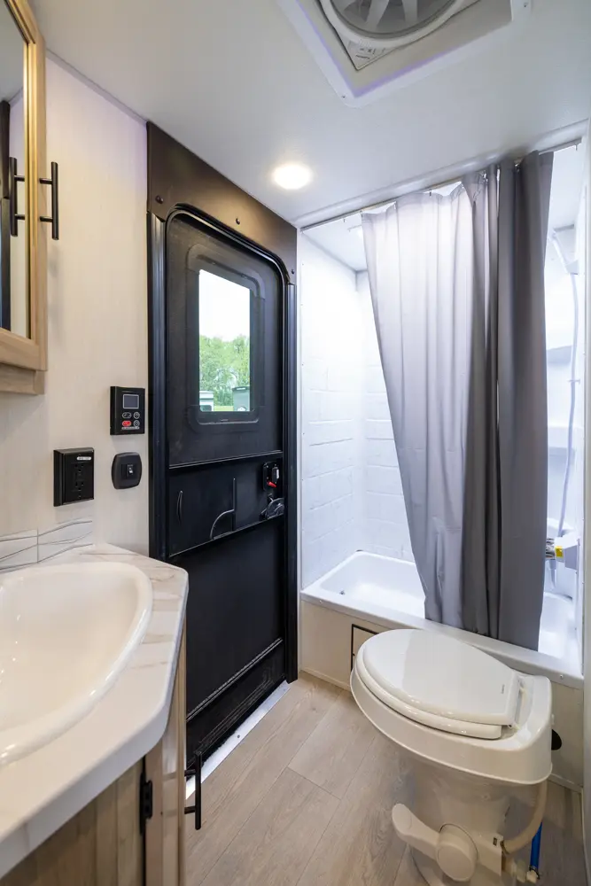• Blackout Glass, Safety Slam, Friction Hinge Entry Door with Window and Shade Prep (N/A on LP models)