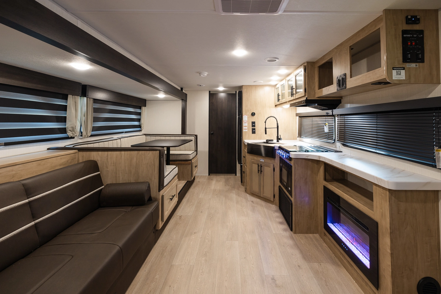 The Cherokee Grey Wolf 26LK by Forest River offers a spacious and luxurious layout in a compact 32-foot package. The living room and full bathroom provide comfort and convenience, while the rear bedroom, featuring a king-size bed and ample wardrobe space, offers a peaceful retreat. The well-equipped kitchen, with a large 12-volt refrigerator, air fryer combo microwave, and utility sink, is perfect for cooking and entertaining. Experience the comfort and style of the Cherokee Grey Wolf 26LK!