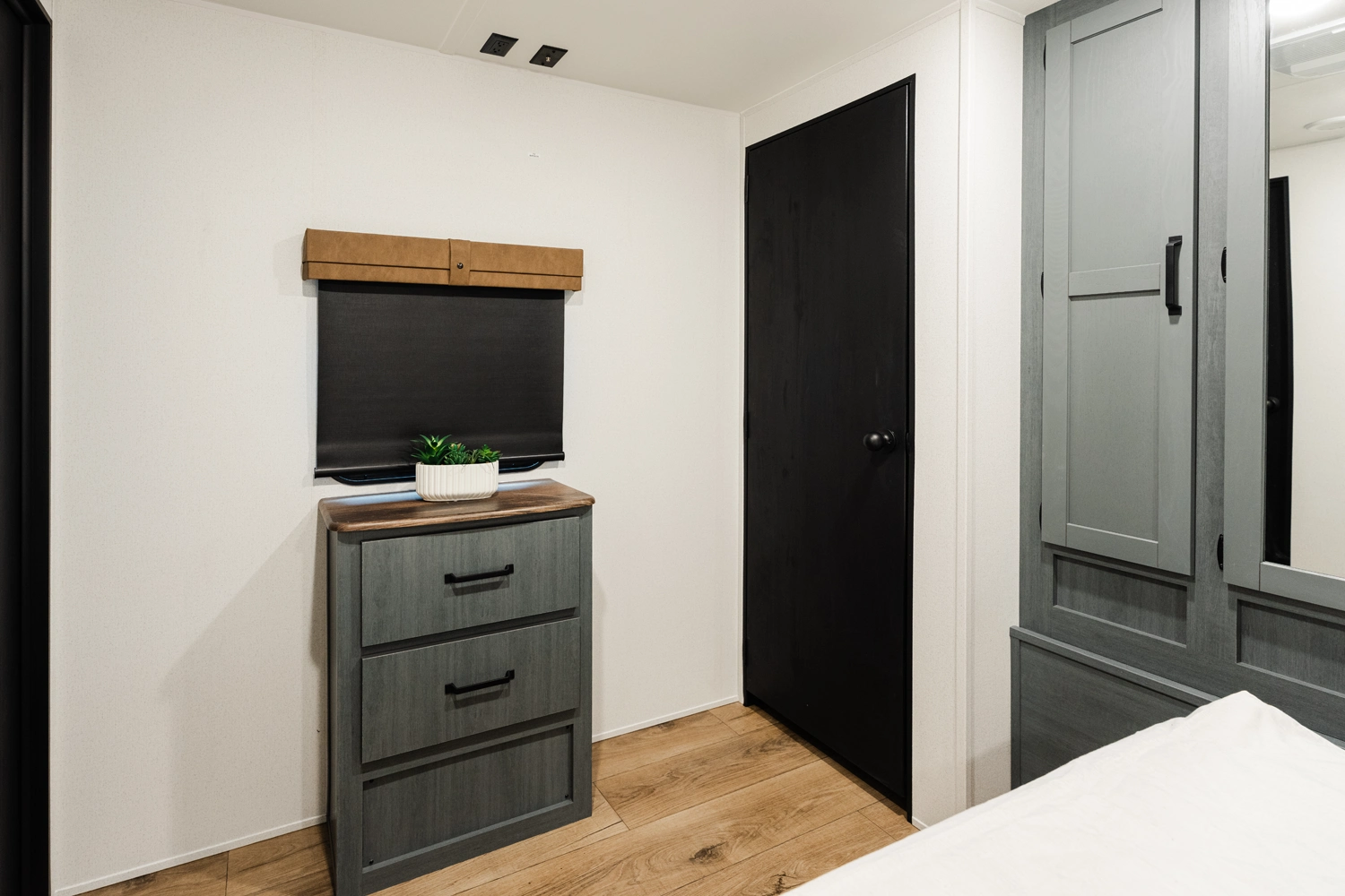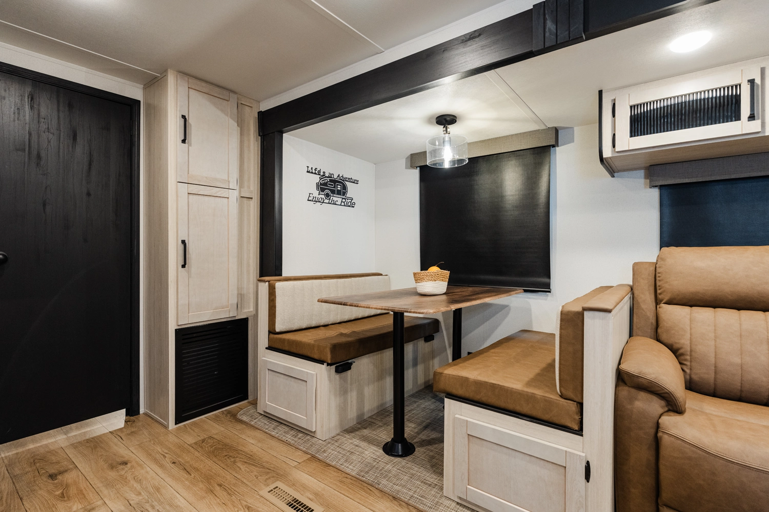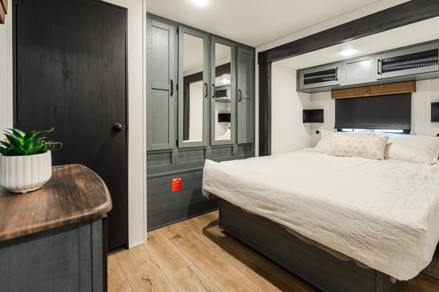 This bunk house travel trailer supplies you a great deal of space in the front bedroom. With a slide out and a large closet for all of your clothes, it will feel like your bedroom at home. The bunk house in the rear provides space for all guests to be comfortable and to make things a cut above, this floor plan provides two bathrooms. Furthermore, the exterior mini camp kitchen features a fridge and a griddle for those of you who like to cook in nature.