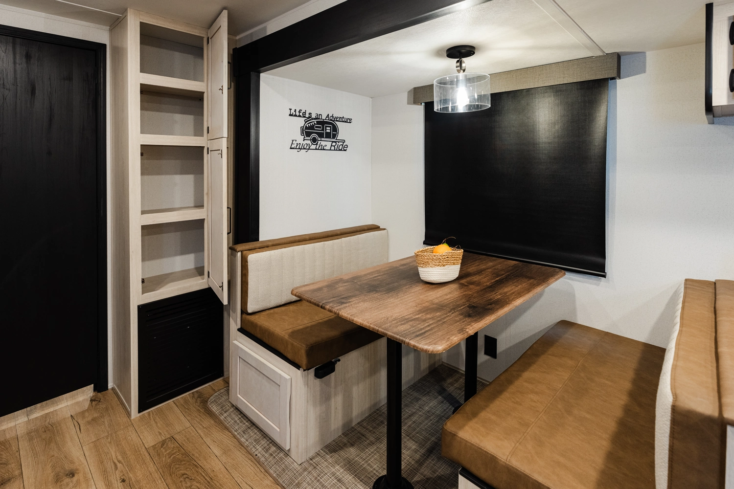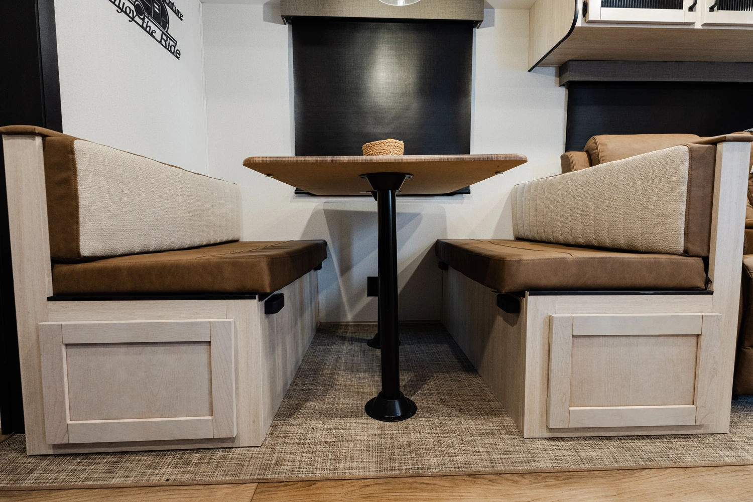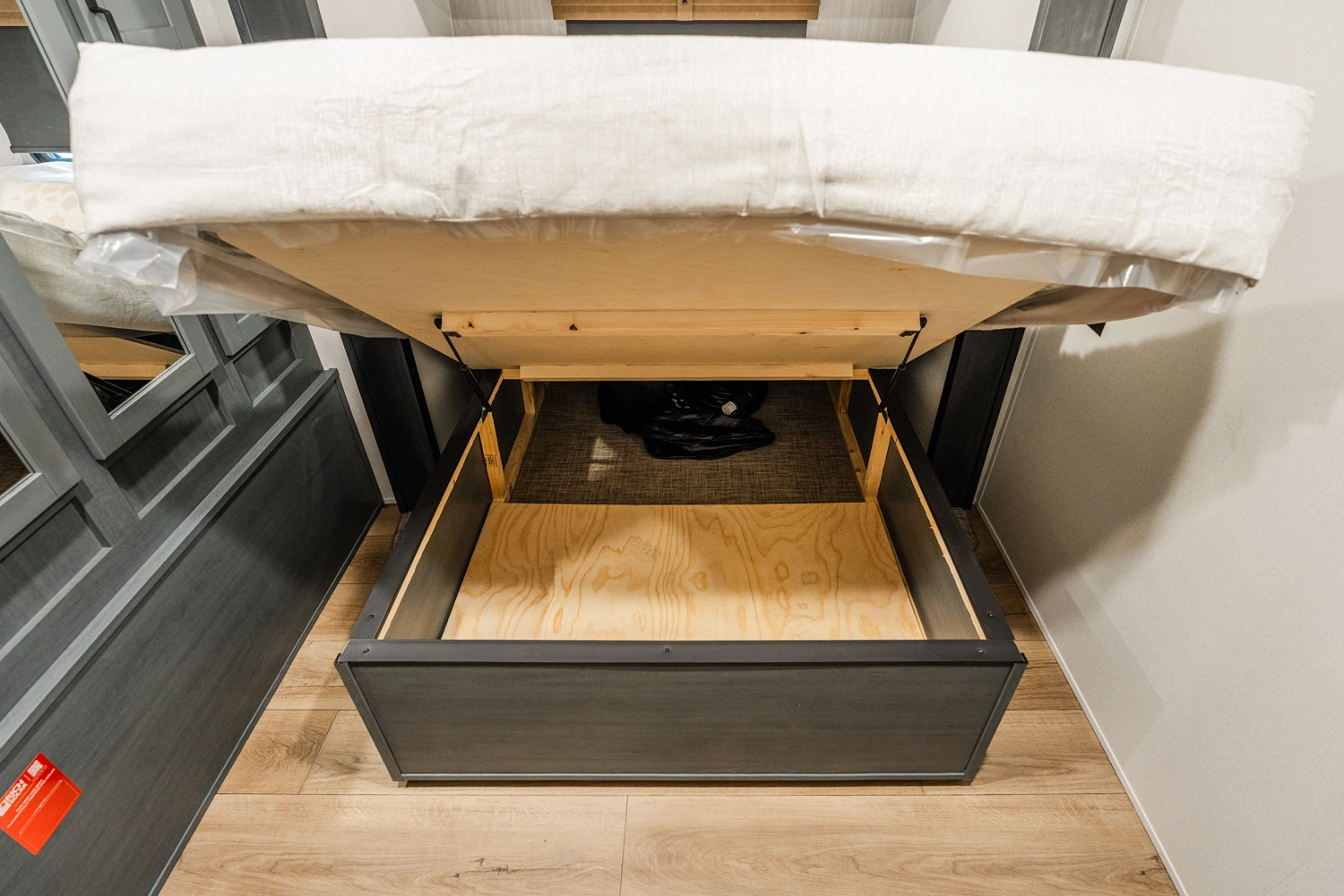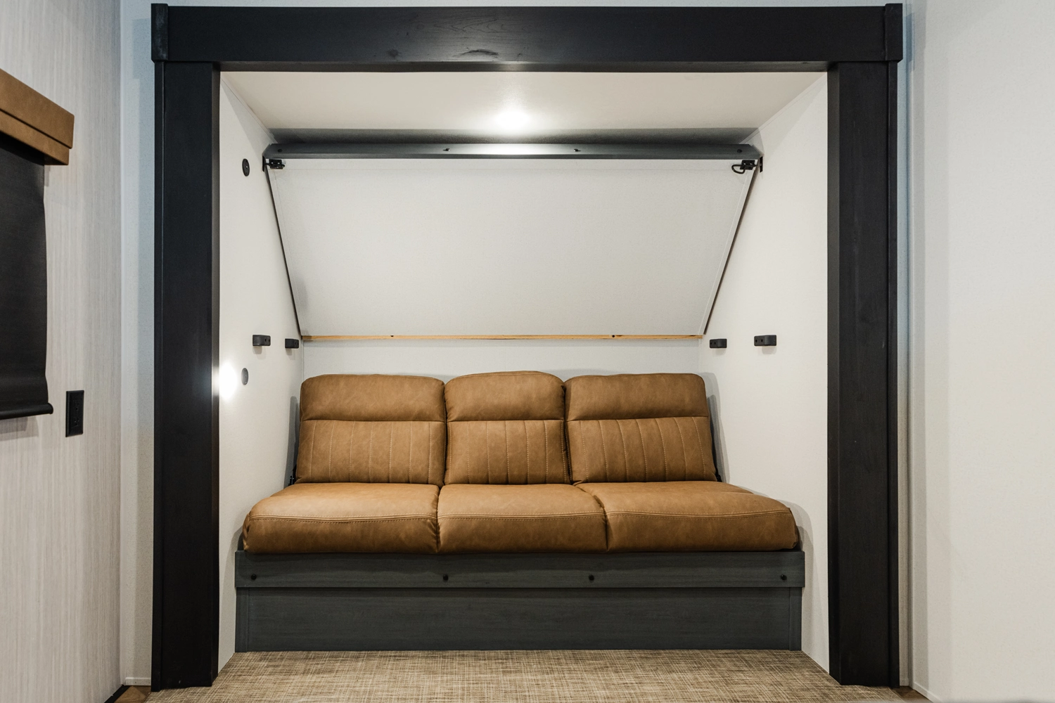 This bunk house travel trailer supplies you a great deal of space in the front bedroom. With a slide out and a large closet for all of your clothes, it will feel like your bedroom at home. The bunk house in the rear provides space for all guests to be comfortable and to make things a cut above, this floor plan provides two bathrooms. Furthermore, the exterior mini camp kitchen features a fridge and a griddle for those of you who like to cook in nature.