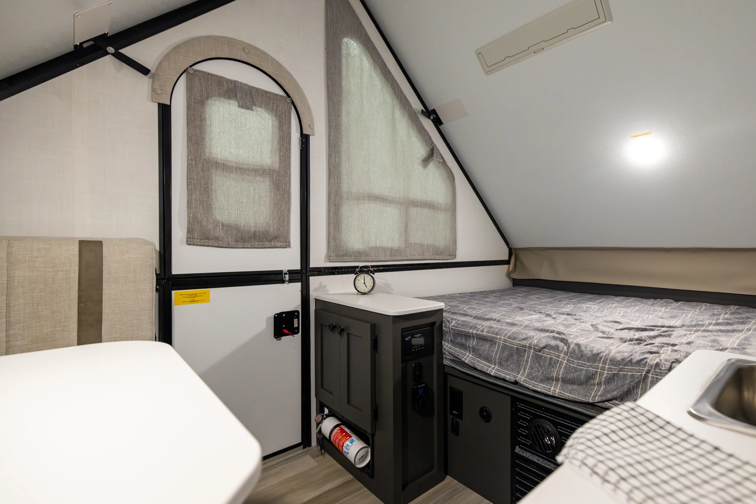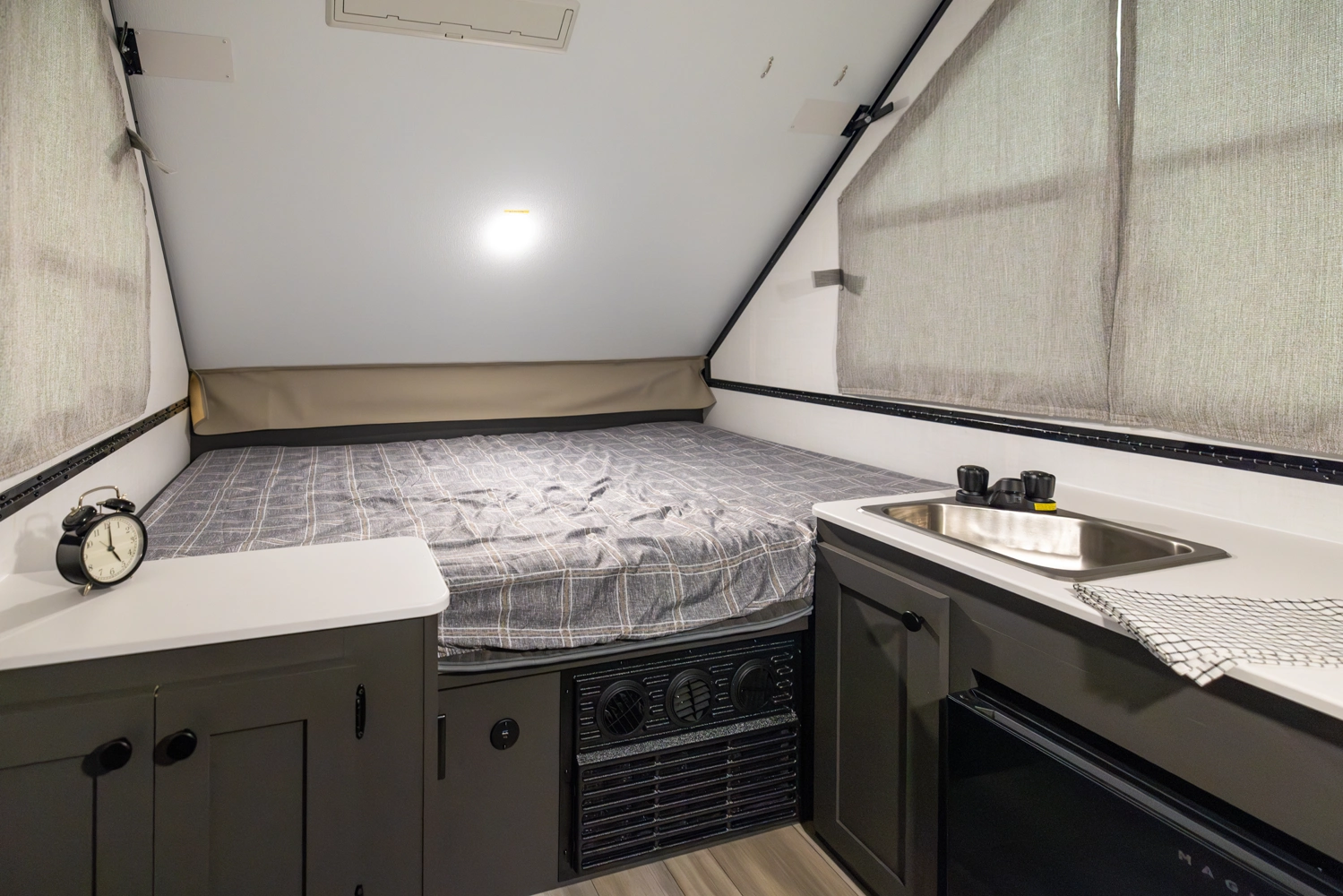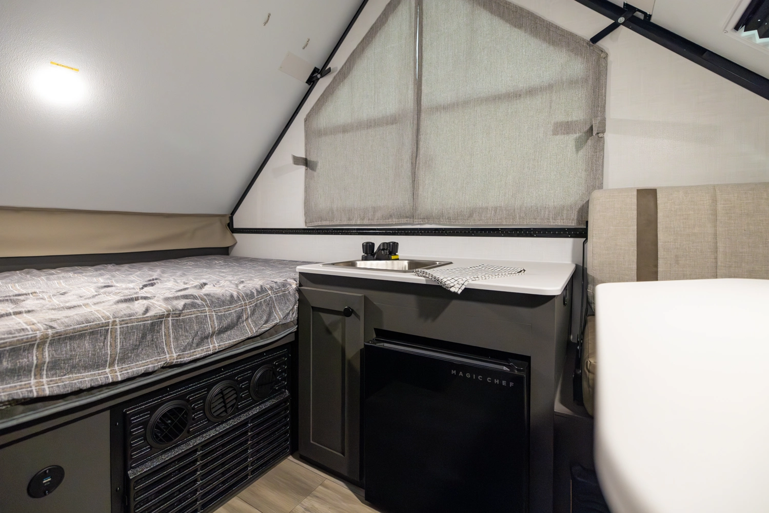 The Rockwood A101RB is a traditional A-frame that blends simplicity with smart design. It features a front 33" x 80" dinette and a rear 54" x 80" bed that flips up for easy access. Inside, you'll have a convenient fridge, and outside, an easy-reach storage trunk and a griddle for cooking up meals wherever you go.