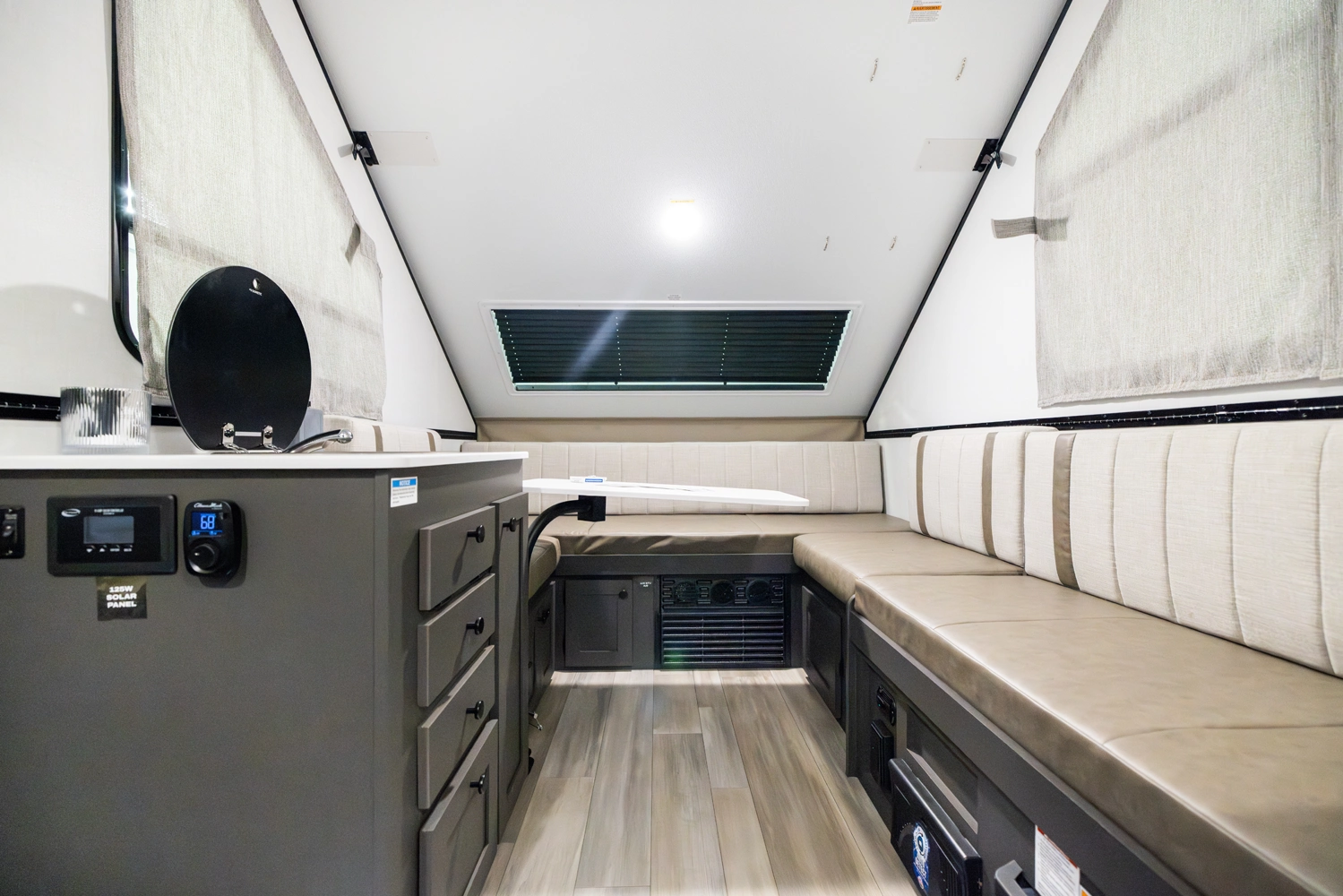 The Rockwood Hard Side A216HS combines compact convenience with smart design. Its front dormer increases headroom while housing a comfortable bunk bed, while the rear gaucho easily converts for relaxing or sleeping. Inside you’ll also find a convenient wet bath, a sink, and a small refrigerator—making this hard side camper a practical and comfortable choice for easy adventures.