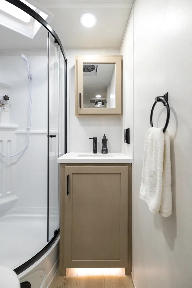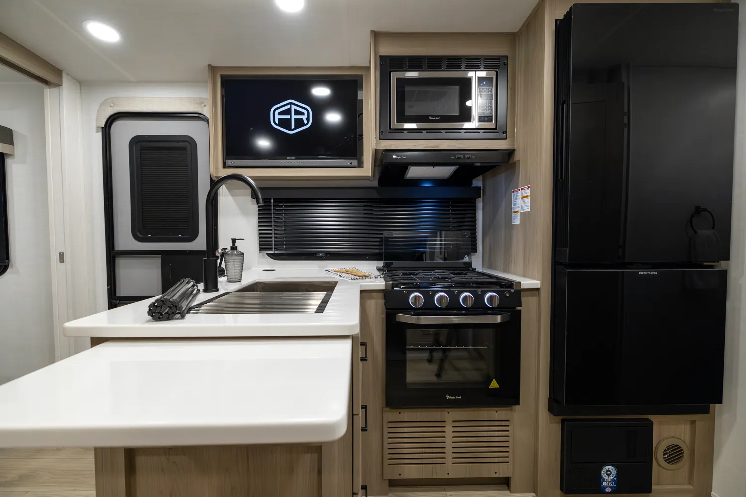 The 2520BH is a bunkhouse layout featuring a segregated front bedroom with a true queen bed and dual wardrobe closets for plenty of personal storage. In the main living area, you'll find a large U-shaped dinette, a spacious kitchen and two 36" x 71" bunks- perfect for kids or guests. This layout blends privacy, comfort, and roominess. An ideal setup for families and groups seeking versatile space on the road.