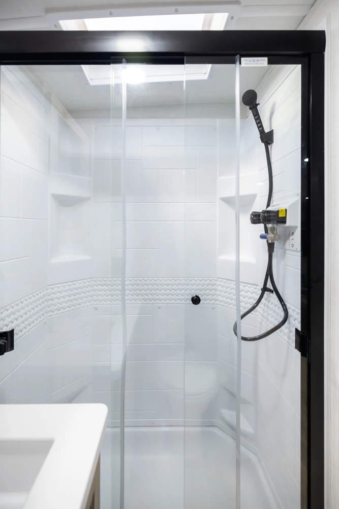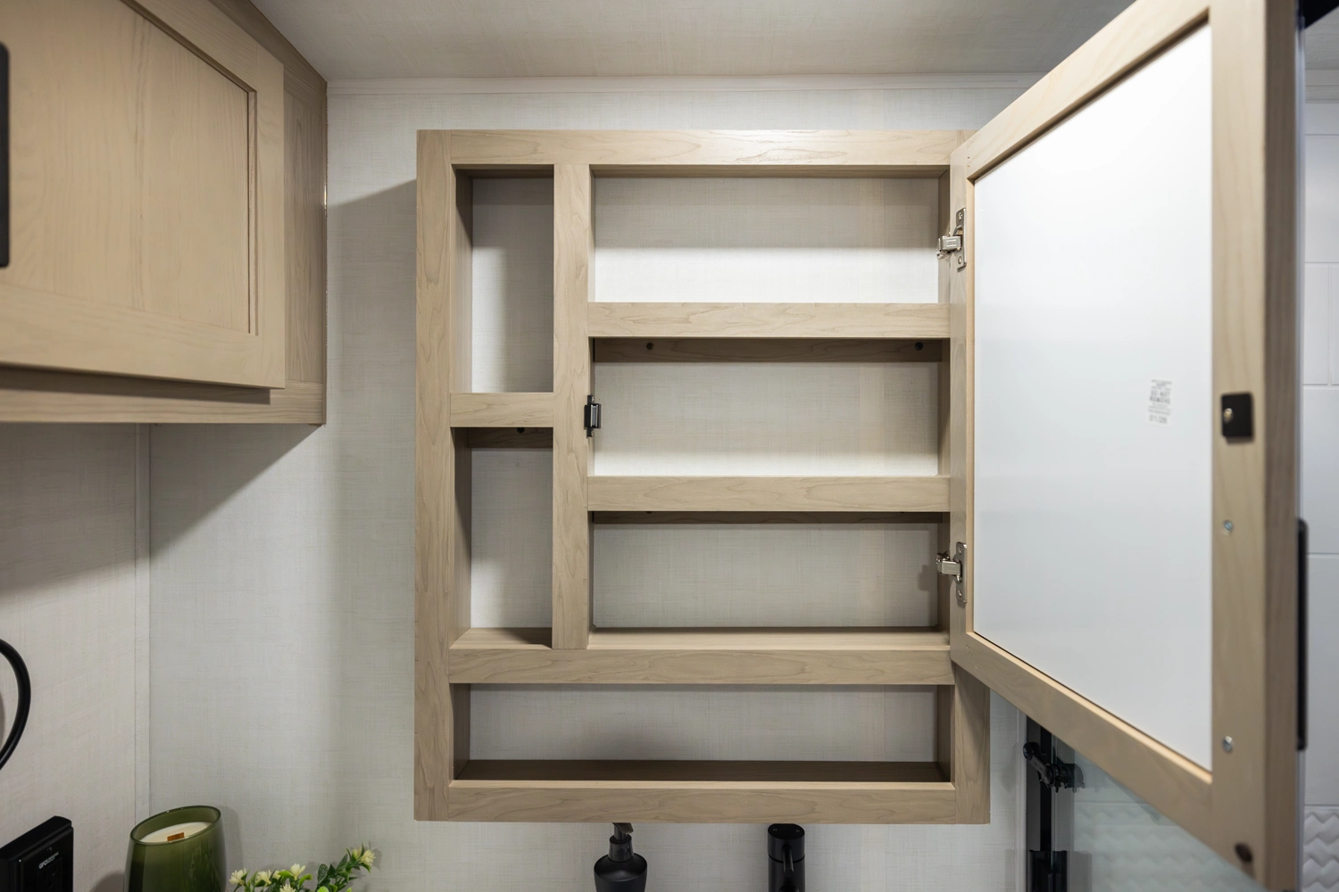 The 2522FB is a beautiful front bedroom floor plan featuring a unique wardrobe/pantry slideout for exceptional storage and organization. The living area includes theater seating directly across from the adjustable “televator” which raises for TV viewing and lowers so you can enjoy the massive door side window views. A versatile dinette and spacious rear kitchen with plenty of counter space completes the thoughtful design.