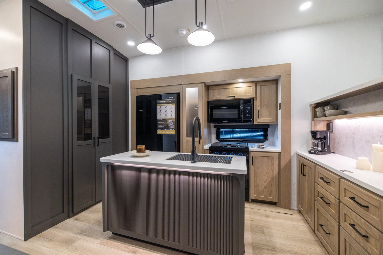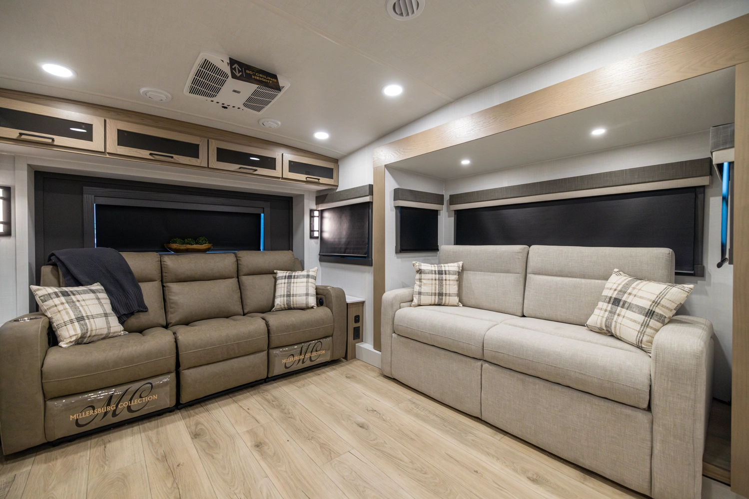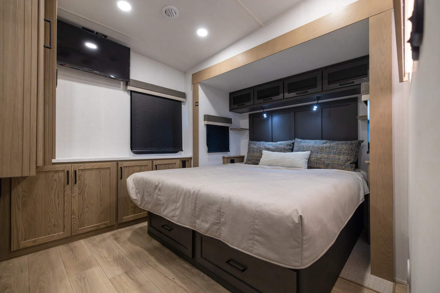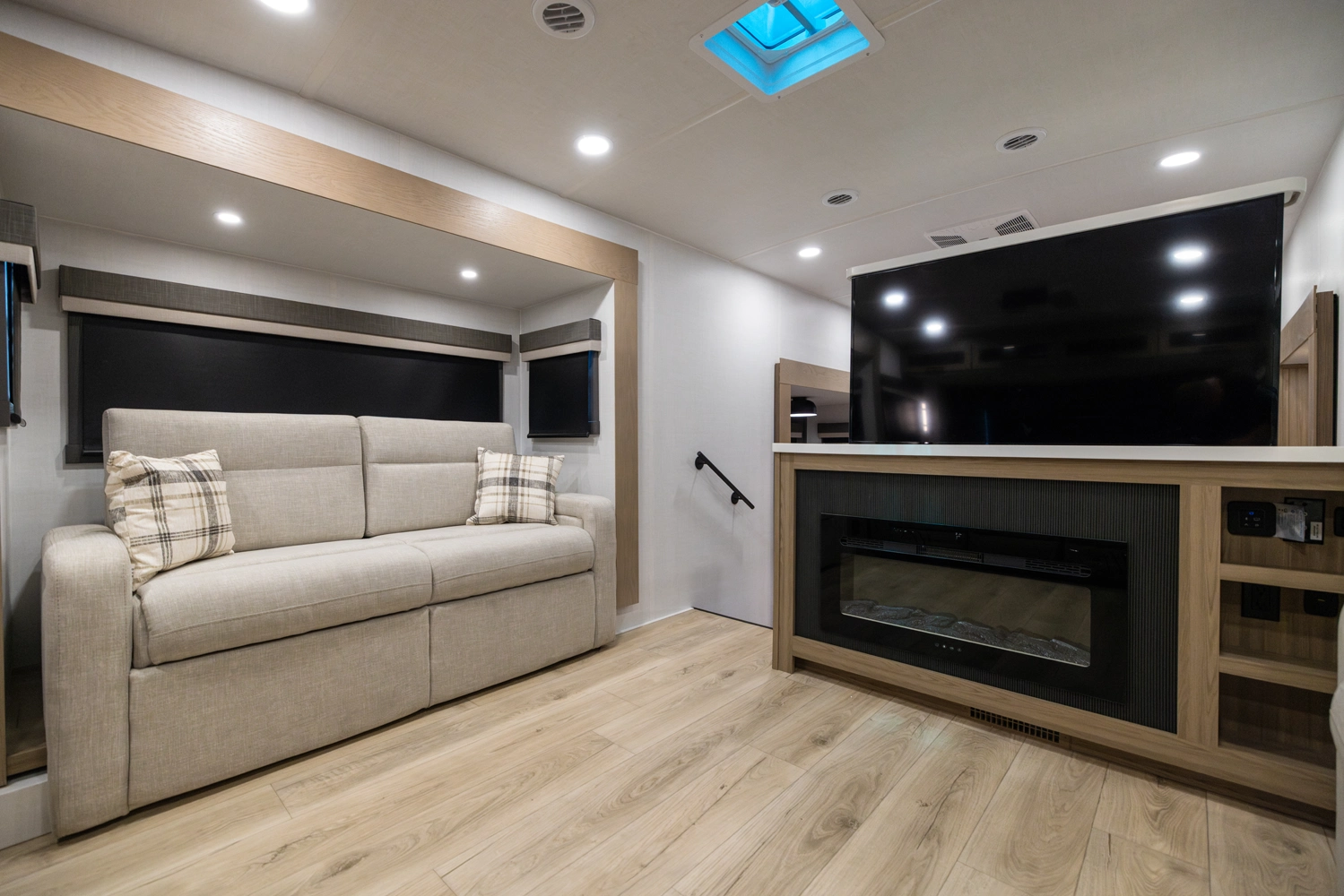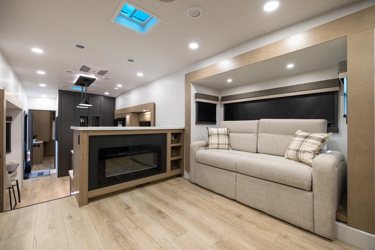 A premium front-living fifth wheel with superior construction and residential comforts. This 40' coach features five slides, a spacious front living area with Televator TV and theater seating, a central kitchen with massive island, king-size bedroom, cozy bath, dual awnings. travel farther stay longer and camp in true comfort!