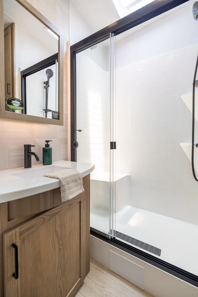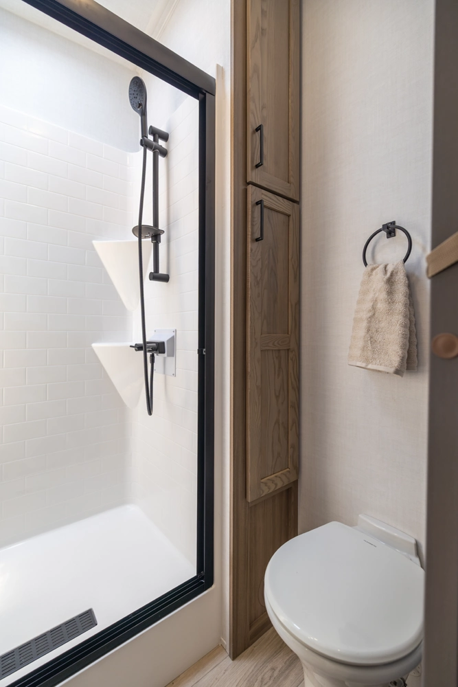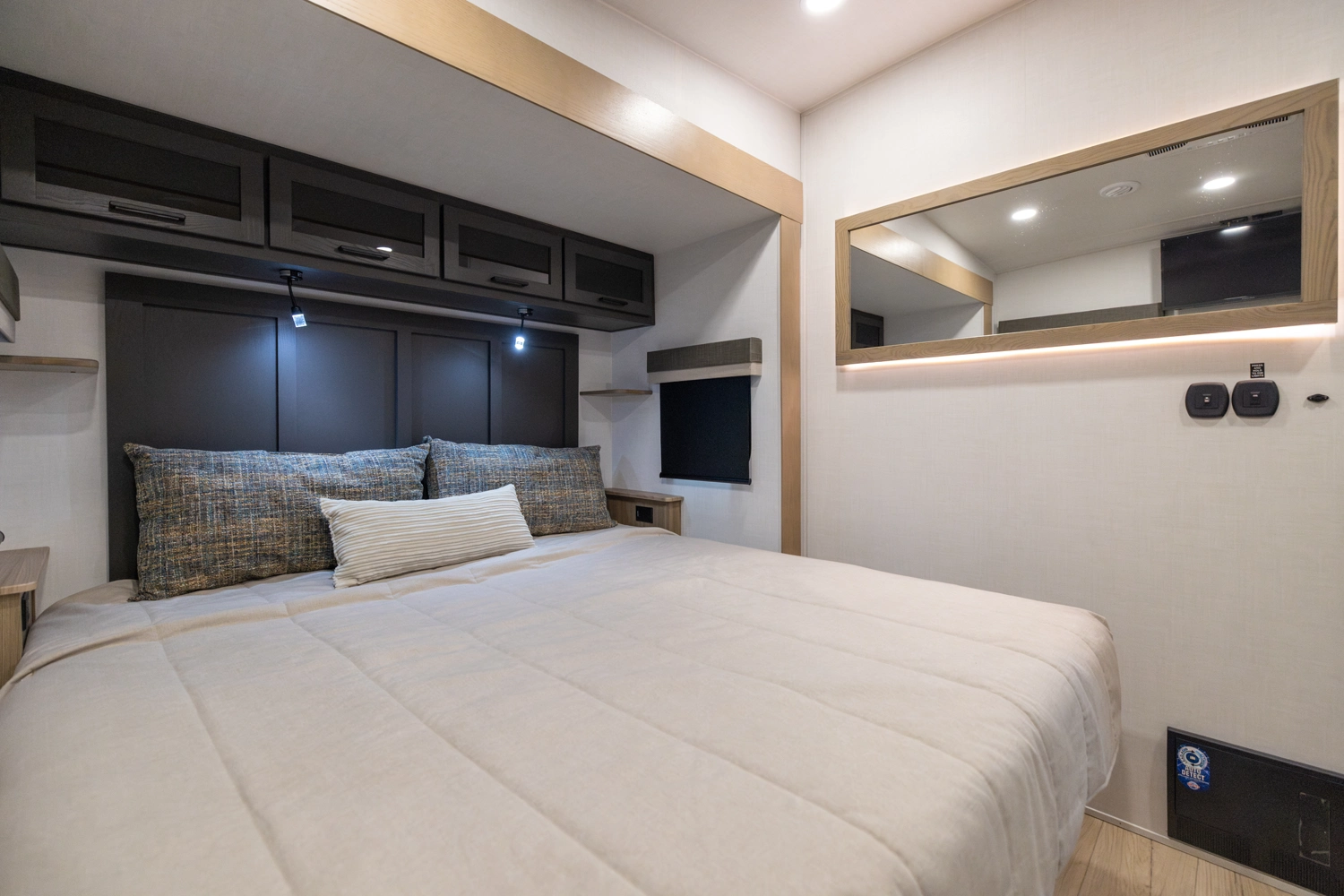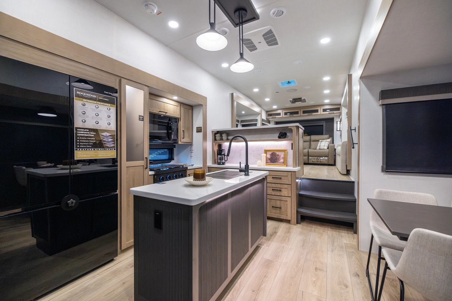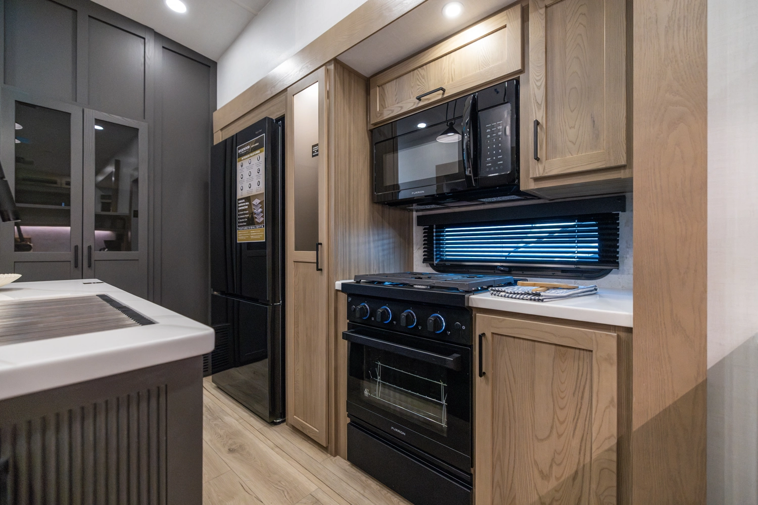 A premium front-living fifth wheel with superior construction and residential comforts. This 40' coach features five slides, a spacious front living area with Televator TV and theater seating, a central kitchen with massive island, king-size bedroom, cozy bath, dual awnings. travel farther stay longer and camp in true comfort!