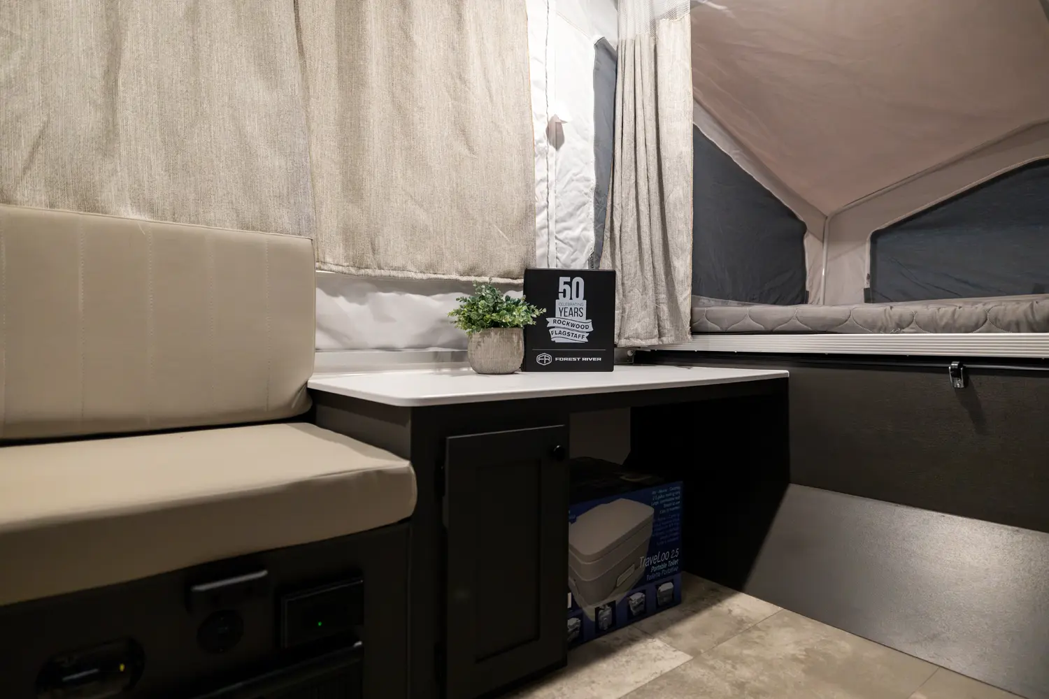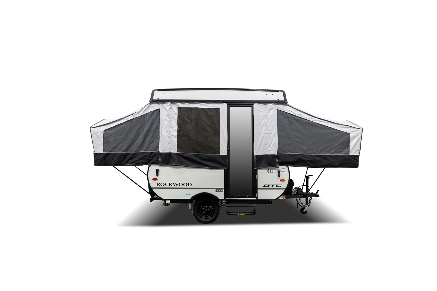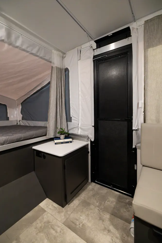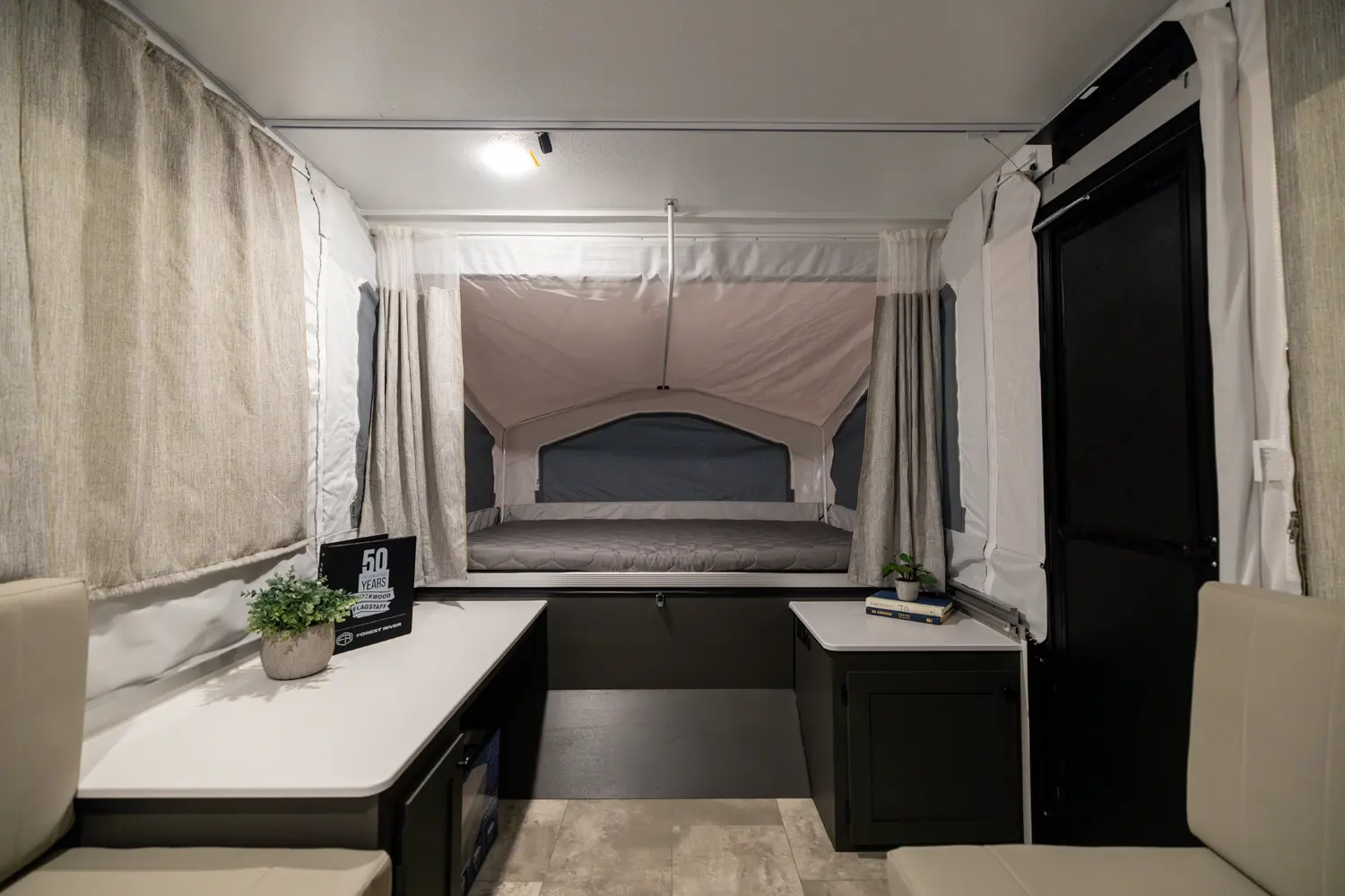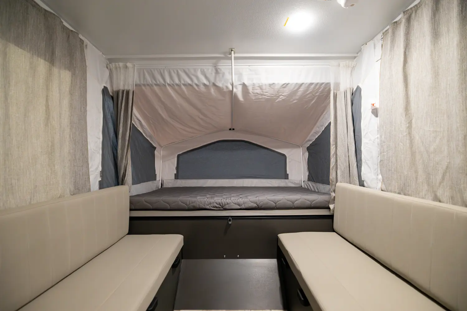 The 160TG is a compact pop-up designed for flexibility and comfort. It features two sliding bed ends: a front sleeping platform of 54" x 78" and a rear platform of 42" x 78". Inside, you’ll find a cozy dinette and convenient cabinetry, making it a perfect fit for simple, comfortable camping.