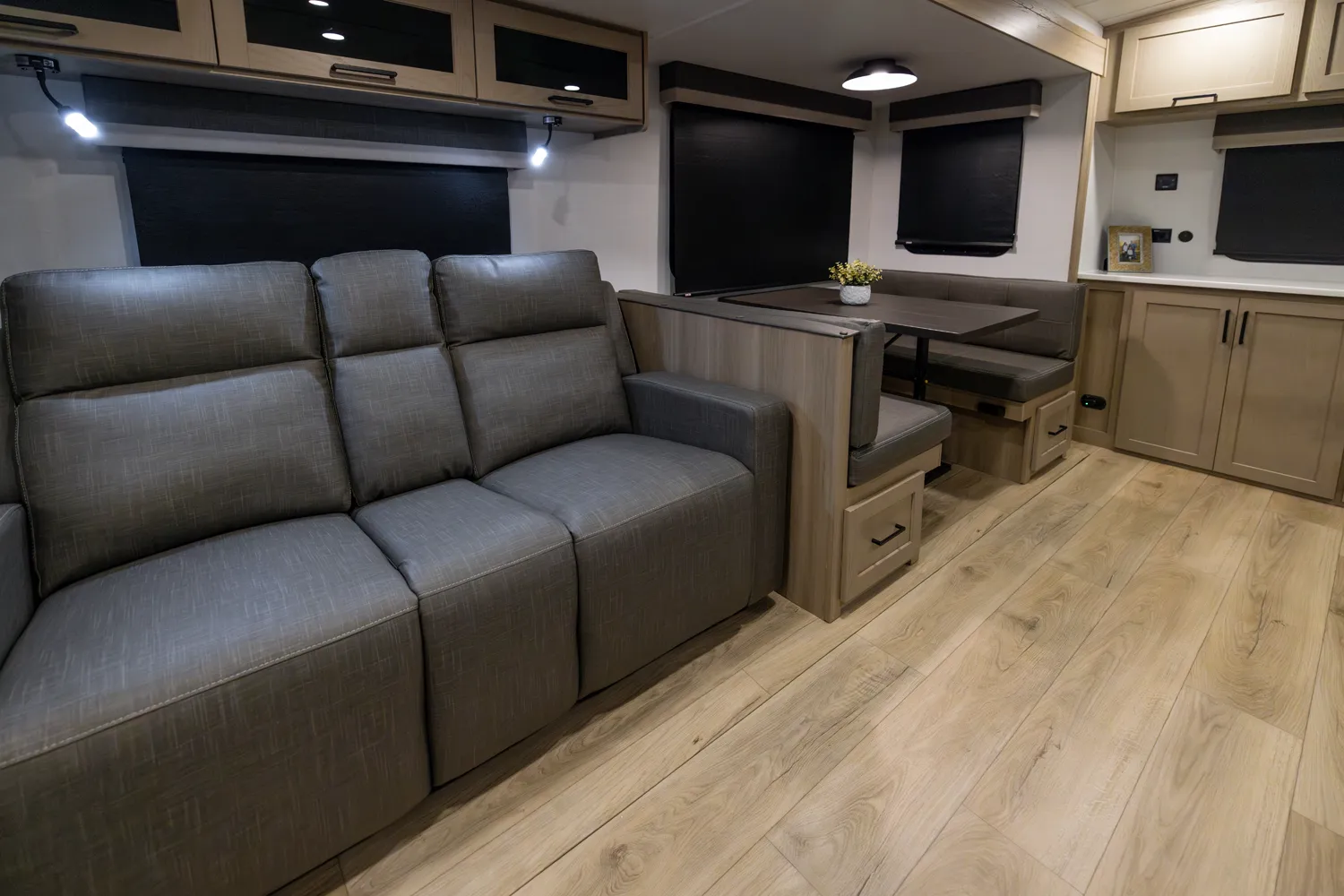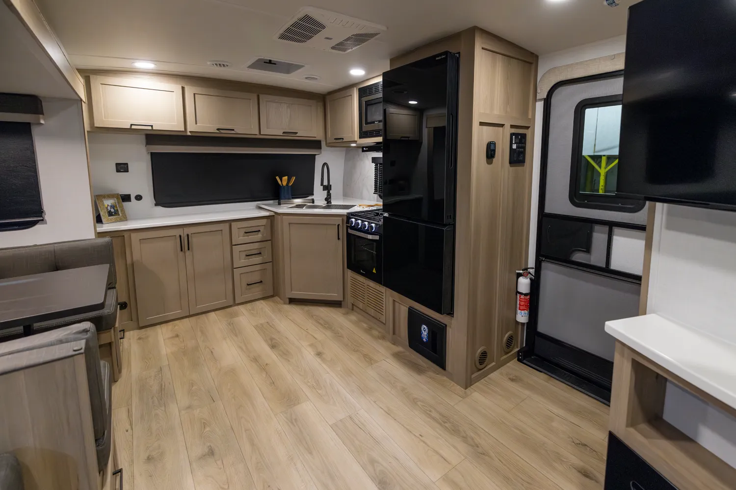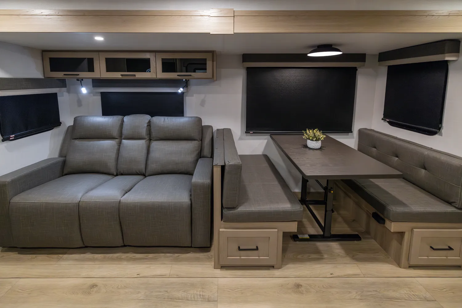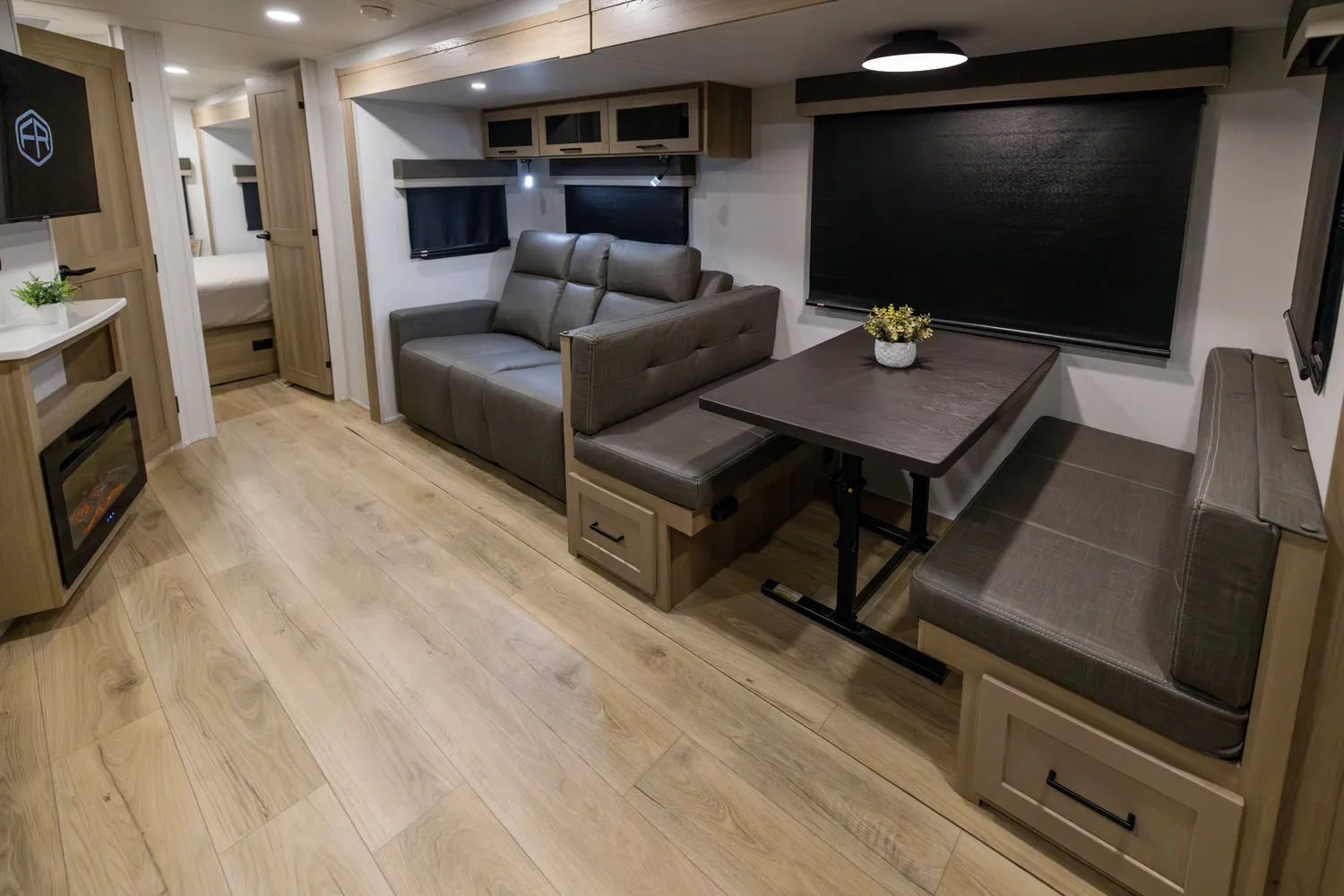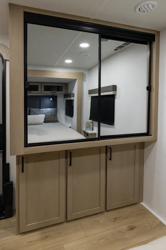 Holy counter space! This front kitchen offers a ton of counter space with a giant window to enhance the camping experience. The 67" theater seating is conveniently located right in front of the entertainment center and the cozy space heating fireplace. The master bedroom offers a big 60"x 80" queen bed slide out which makes the room feel residential. This bedroom has a separate entry and exit door that is also covered by the giant 21' awning.