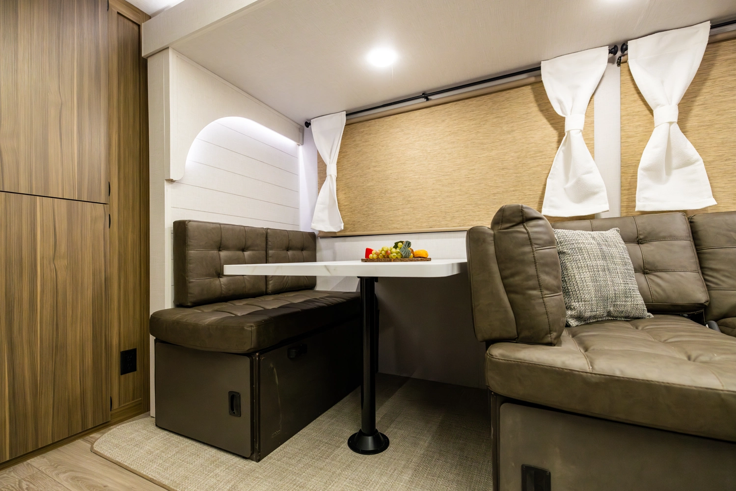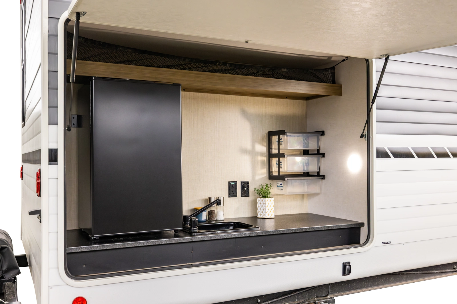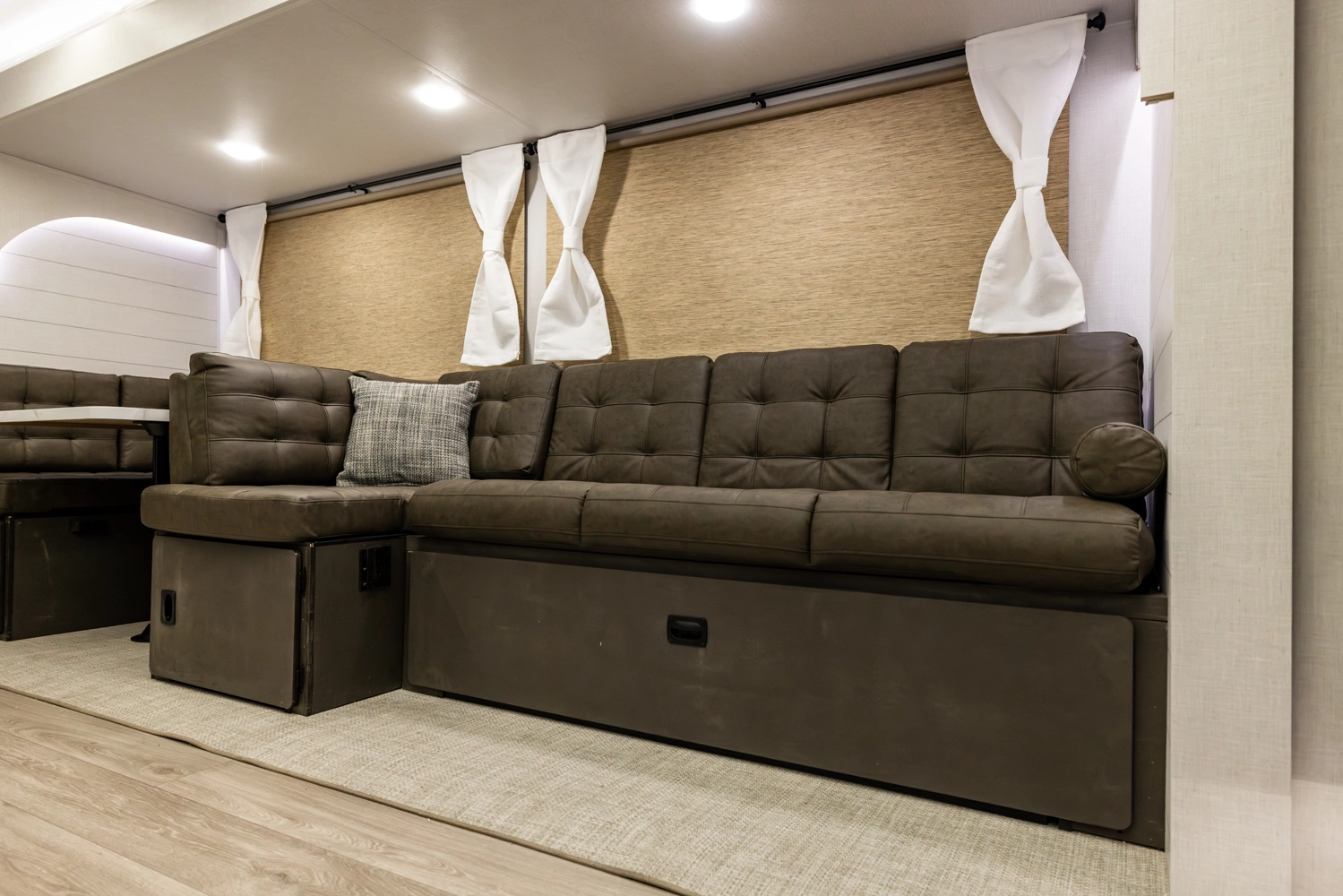 The 33TS is the ultimate bunkhouse, with three total slide outs and an outside kitchen. This well-equipped travel trailer features oversized panoramic windows and the desirable Versa-Lounge. The back-bunk room features the Versa-Queen giving this floorplan the option for two queen beds!