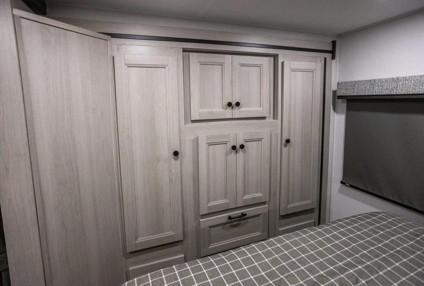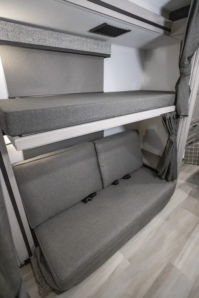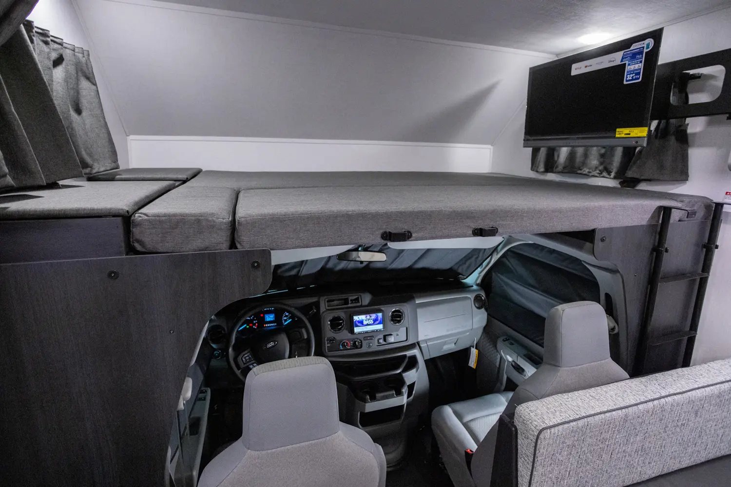 The Solera 32DSB is built on the Ford E450 chassis. This motorhome provides sleeping space for adults and kids alike, with a rear 60" x 74" queen bedroom that includes a wardrobe, plus a 28" x 72" flip-down bunk above the kid's sofa sleeper and the 60" x 80" bunk over cab. You could even transform the booth dinette and sofa into extra sleeping spaces if needed. The kitchen area is fully equipped for meals on the go, with a 10.7 cu ft 12V refrigerator, recessed 3-burner range with flush glass cover, and a 1.3 cu ft convection microwave oven. Overhead cabinets provide additional storage. The 60" x 80" bunk over cab provides more room for sleeping plus a 12V LED TV for extra entertainment!