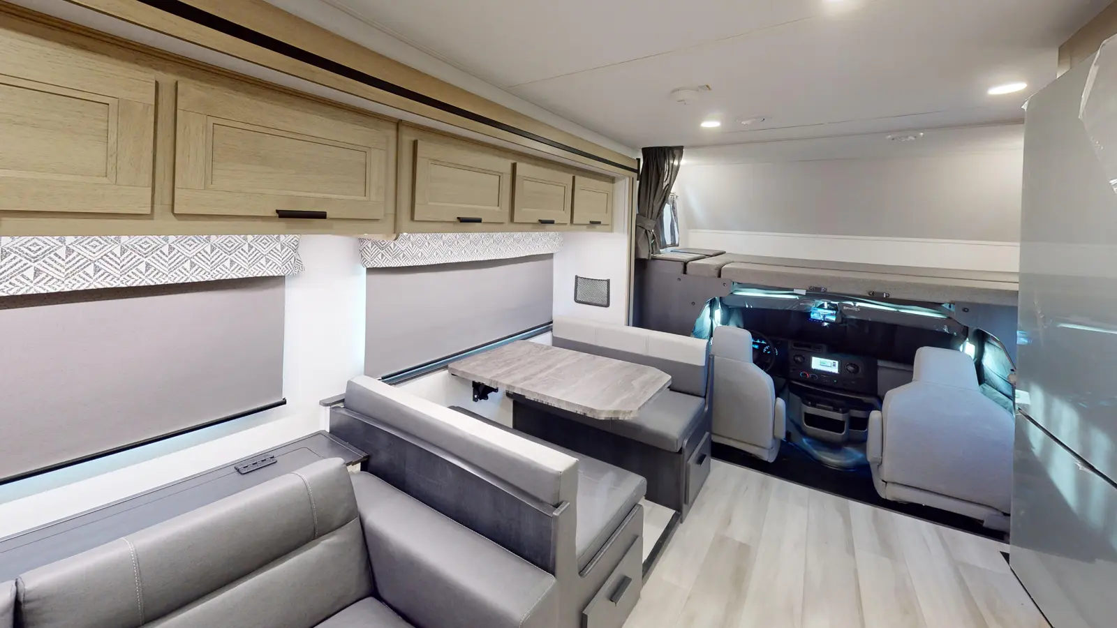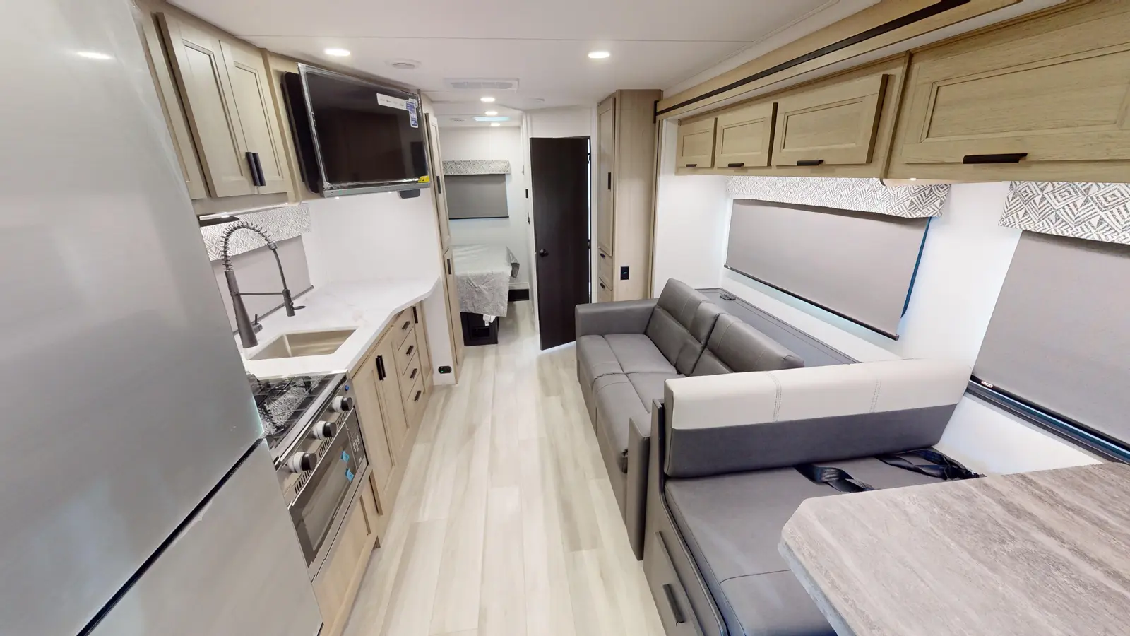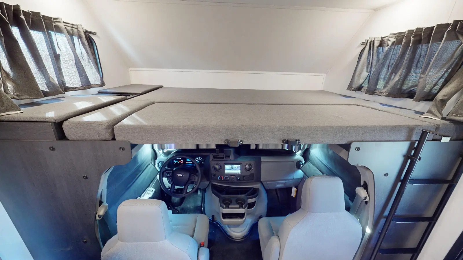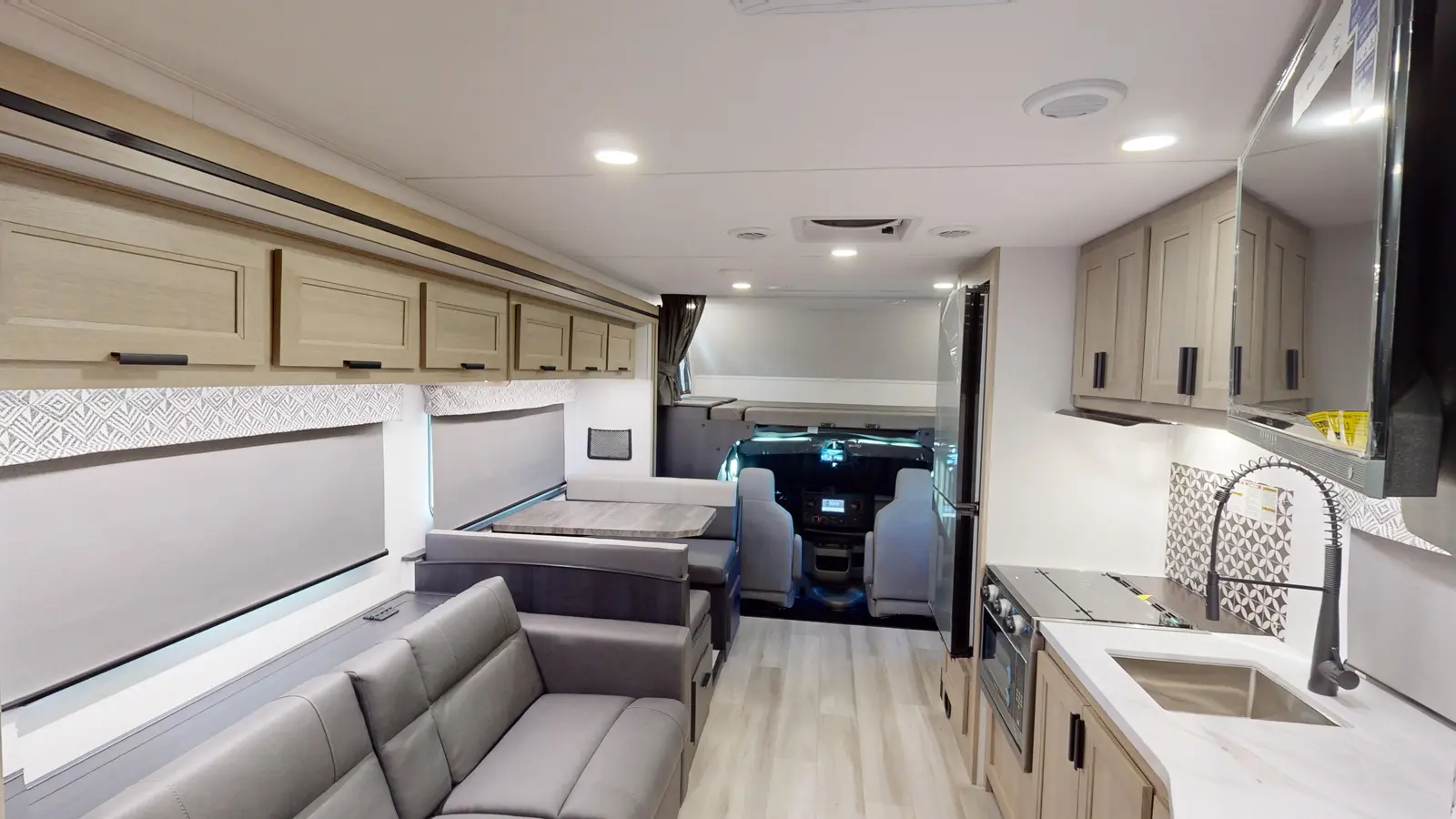 The 2550DSLE is built on the Ford E450 chassis. The rear queen bedroom includes a 60" x 80" wedge mattress for enhanced sleep. The wall is prepped for a bedroom TV. The kitchen has a cooktop, 12V refrigerator, convection microwave, and work station. There's a slideout that contains both a booth dinette and sofa. In the front, a 60" x 80" cab over bunk provides extra sleeping and storage. This unit features a flush floor in the bedroom and living areas, with no step-ups or step-downs.