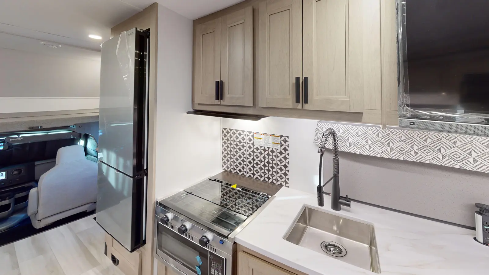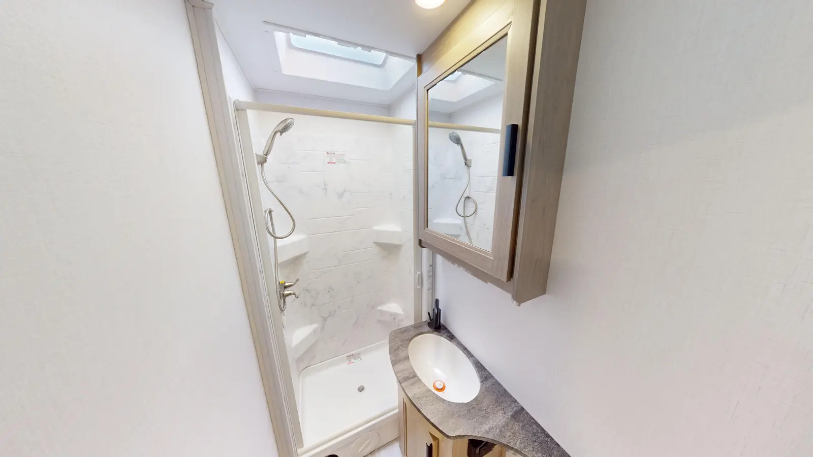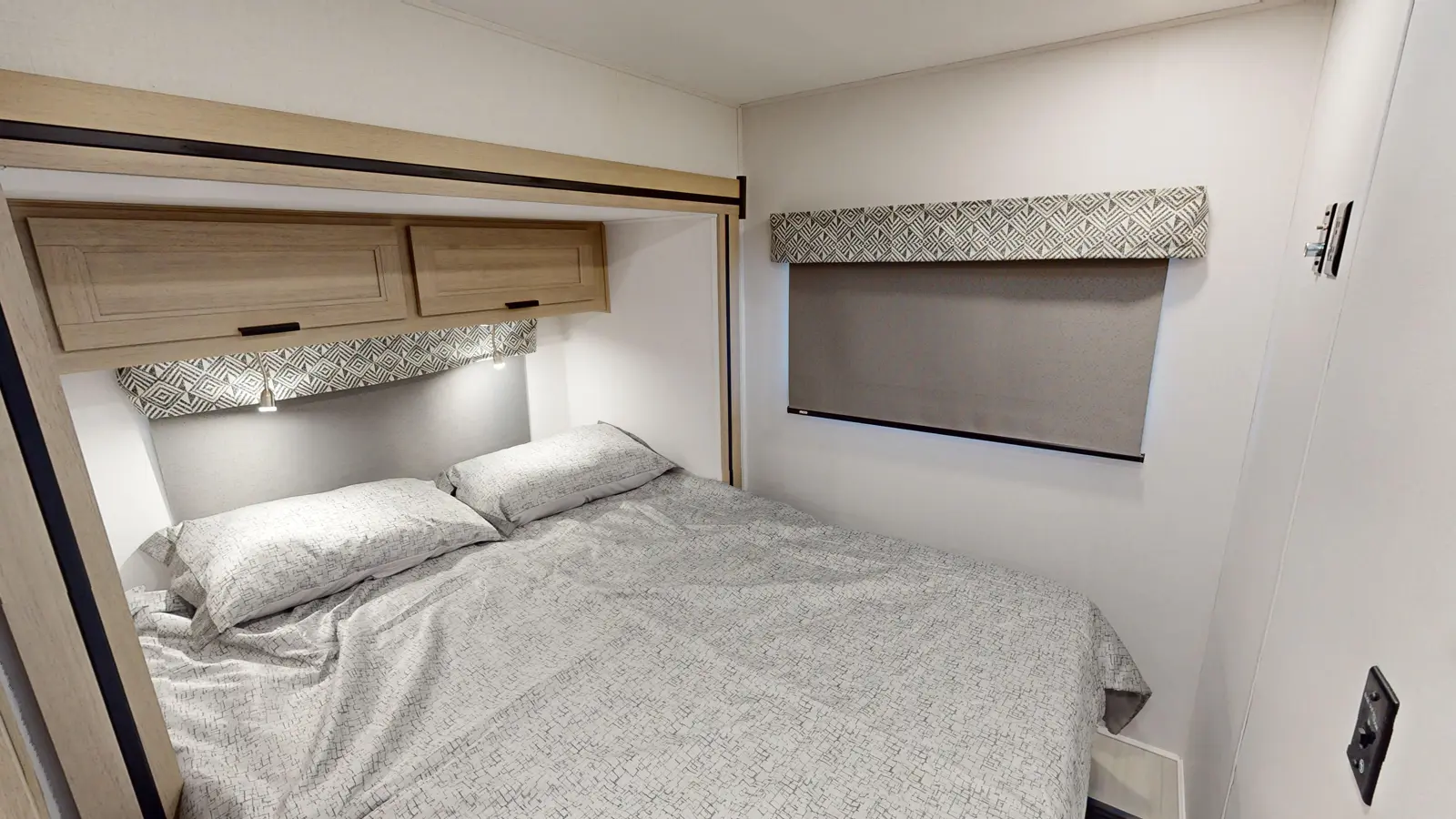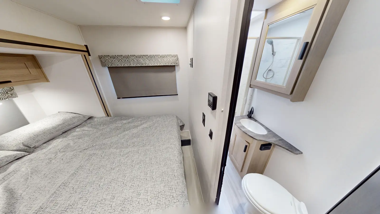 The 2550DSLE is built on the Ford E450 chassis. The rear queen bedroom includes a 60" x 80" wedge mattress for enhanced sleep. The wall is prepped for a bedroom TV. The kitchen has a cooktop, 12V refrigerator, convection microwave, and work station. There's a slideout that contains both a booth dinette and sofa. In the front, a 60" x 80" cab over bunk provides extra sleeping and storage. This unit features a flush floor in the bedroom and living areas, with no step-ups or step-downs.