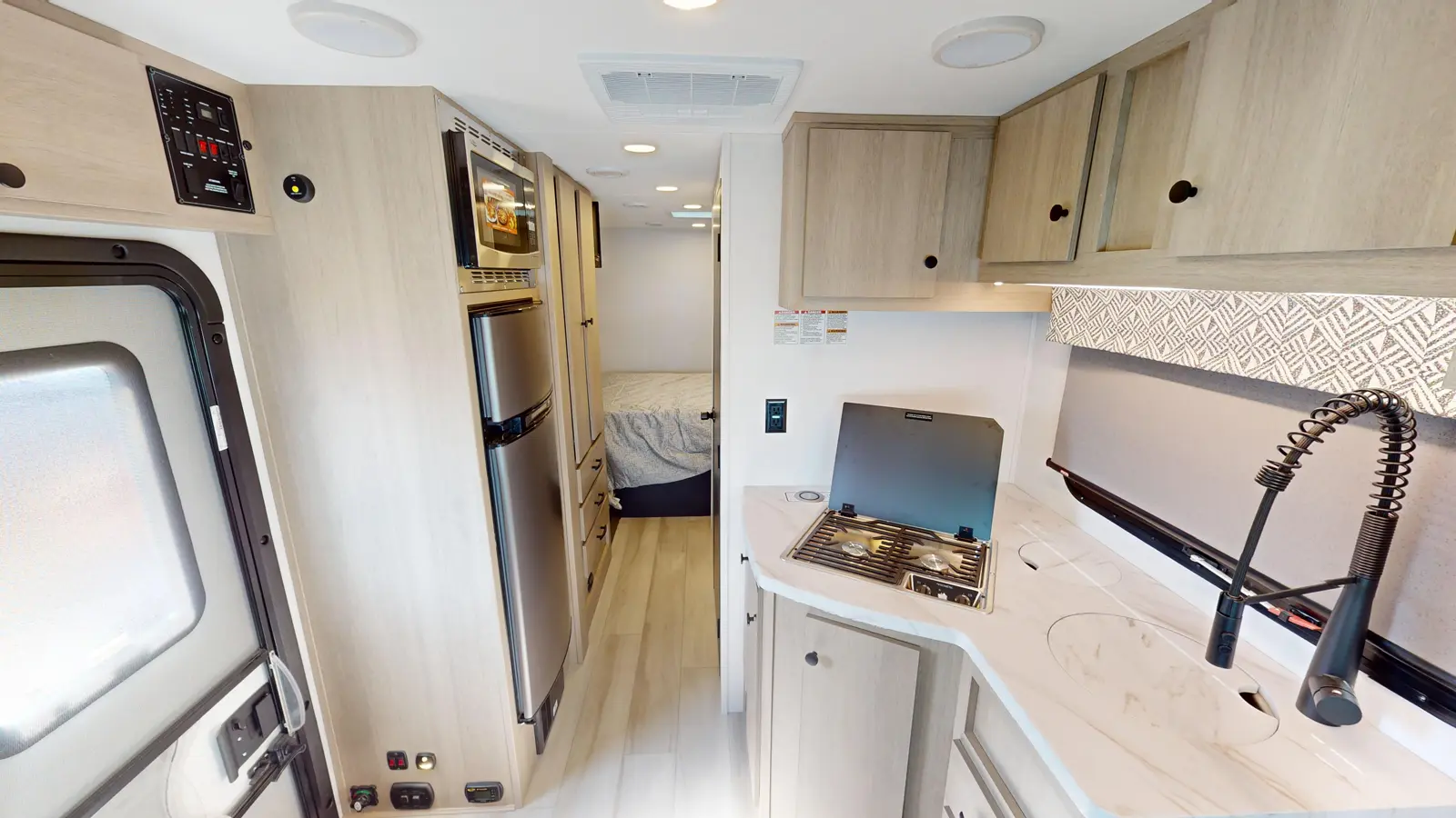 This coach will feel just like home with its double bed in the rear bedroom, a full bath, plus plenty of storage space. The kitchen provides a 12V refrigerator, cooktop, convection microwave, and lots of cabinets. The booth dinette can function as a pair of seats with the table removed, or an additional sleeping surface. This unit is built on the Ford Transit chassis.