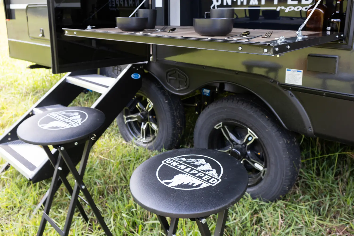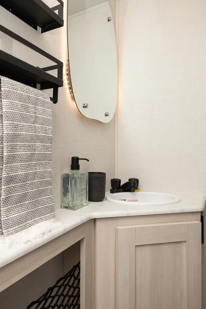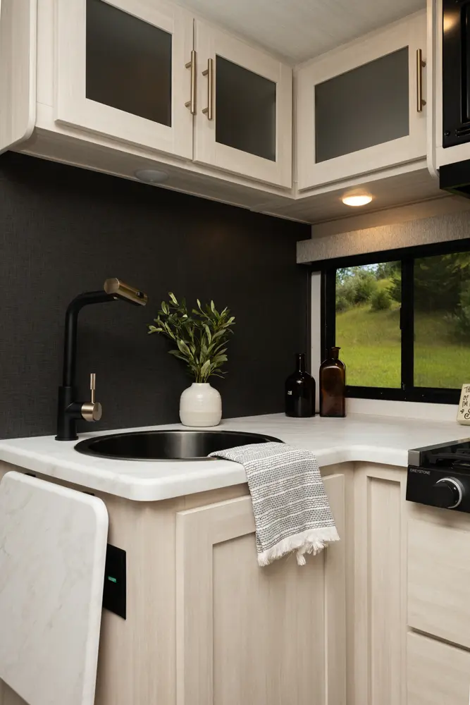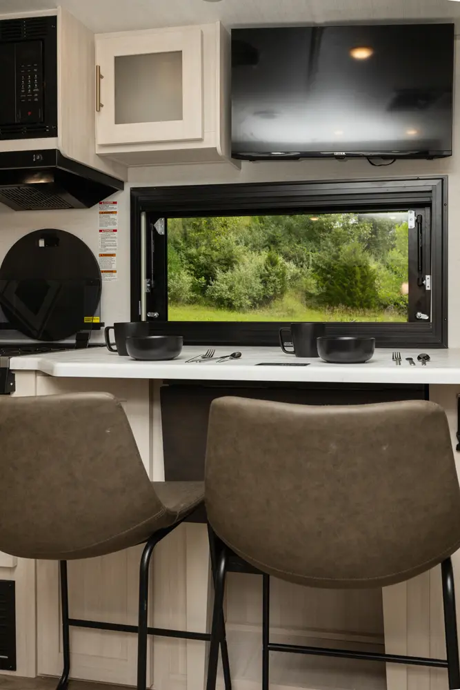 The Un•Mapped 26BH features a rear bunkhouse with double-over-double bunks, accommodating up to four sleepers. The kitchen is equipped with a 12V black glass refrigerator and an air fryer microwave. The Bar2Table pull-out dinette and TrailGate outdoor bar enhance dining flexibility and outdoor entertaining. Inside, enjoy a king bed, 15K A/C, and a tankless on-demand water heater. Exterior amenities include a 21' powered awning and a hot & cold spray port, perfect for compact adventures.