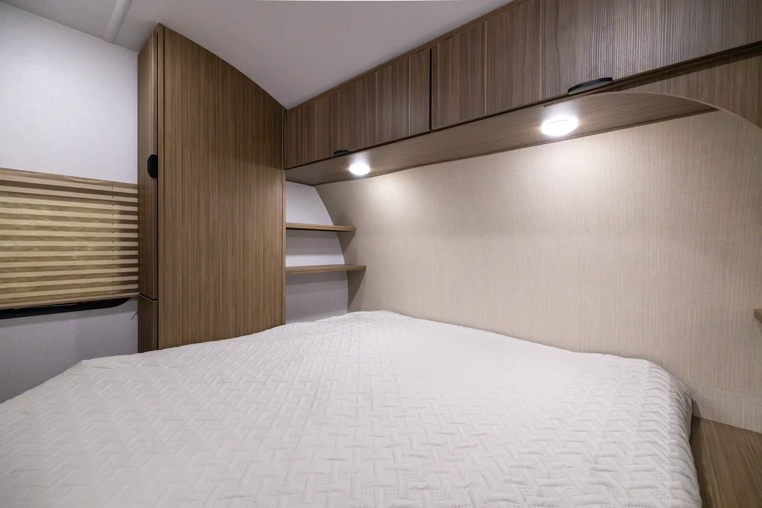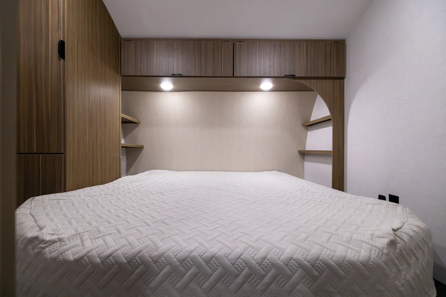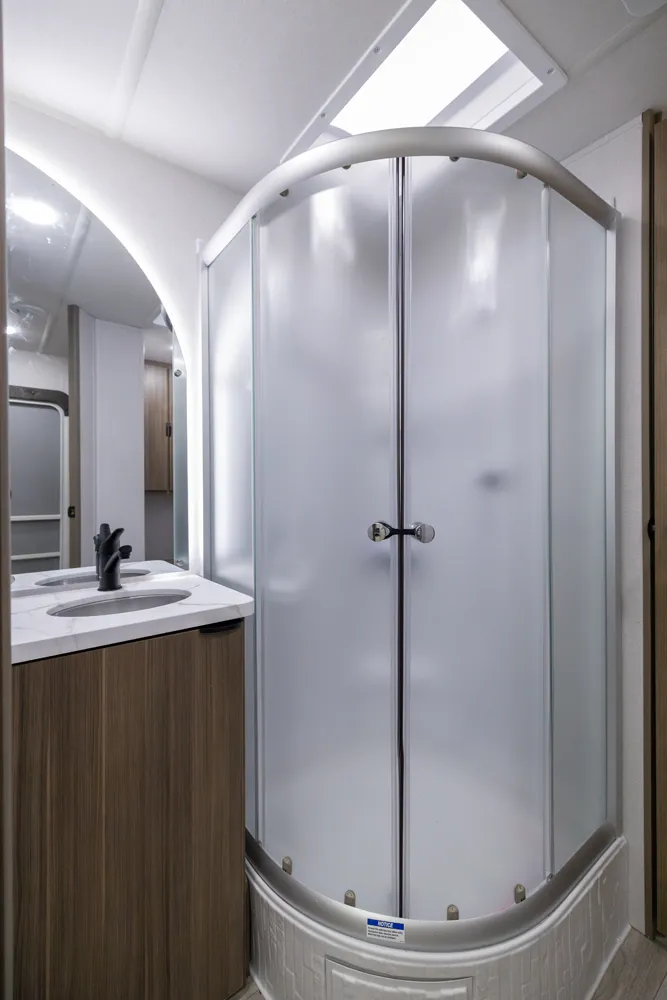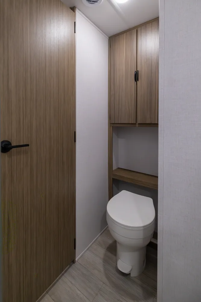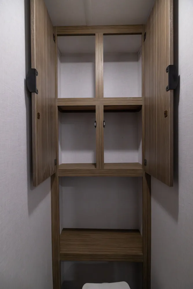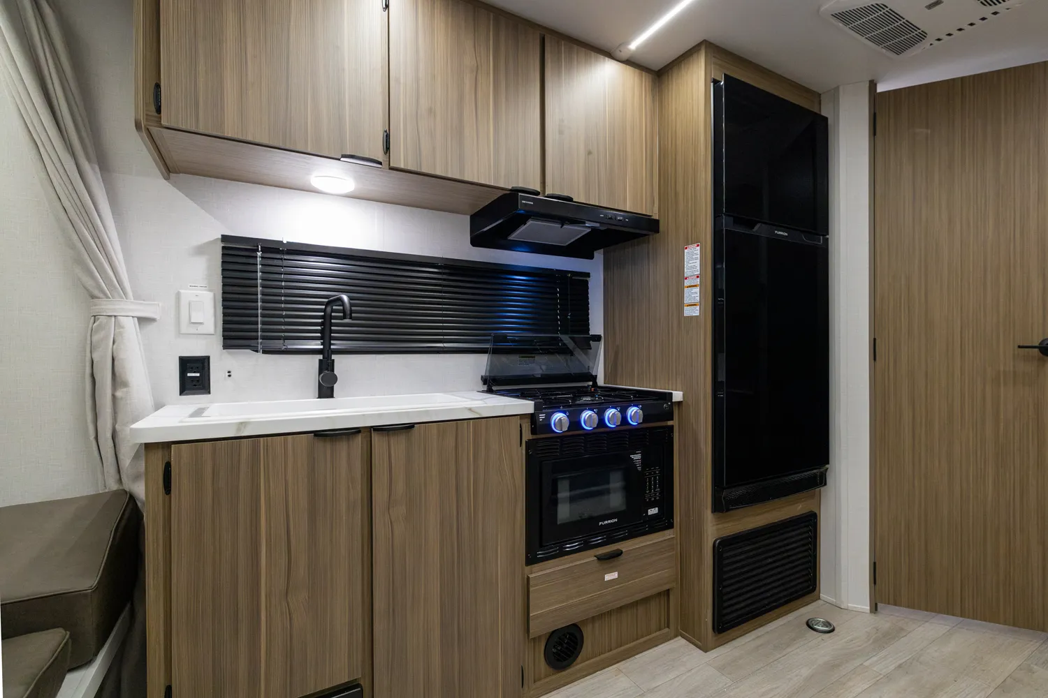 The 260RTK front bedroom provides a queen bed with extra storage, while the adjacent bathroom gives you a large skylight shower and mirrored linen closet. The kitchen provides modern appliances, panoramic window, and a faux stone accent wall with entertainment center. Taking the crew on the road? The flip-down sofas and removable dining table in the garage convert to a king bed. Plus, the ramp door doubles as a party patio. At just over 5000 lb, this toy hauler is ready to roll and easy to tow.