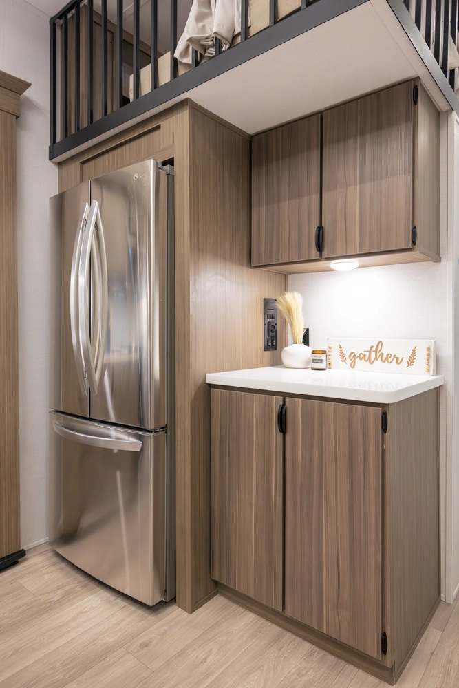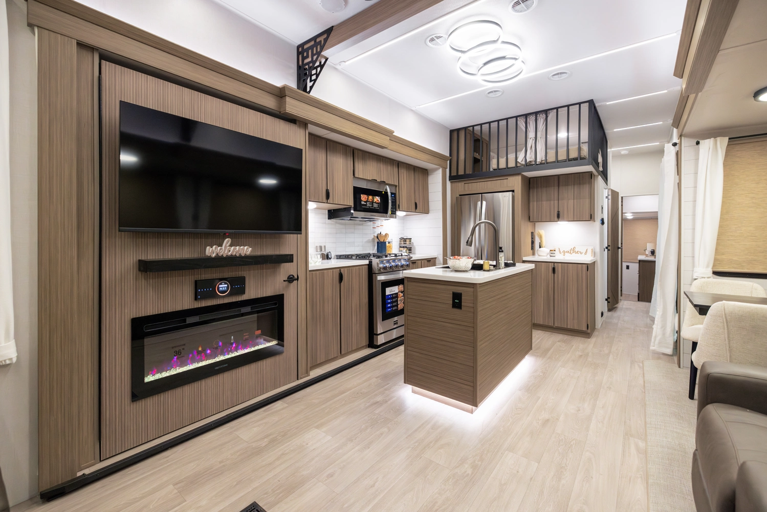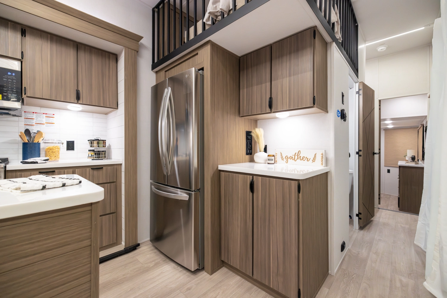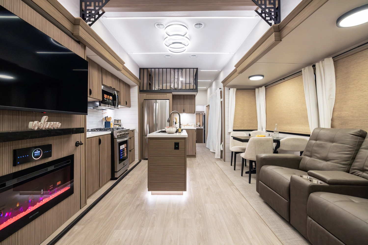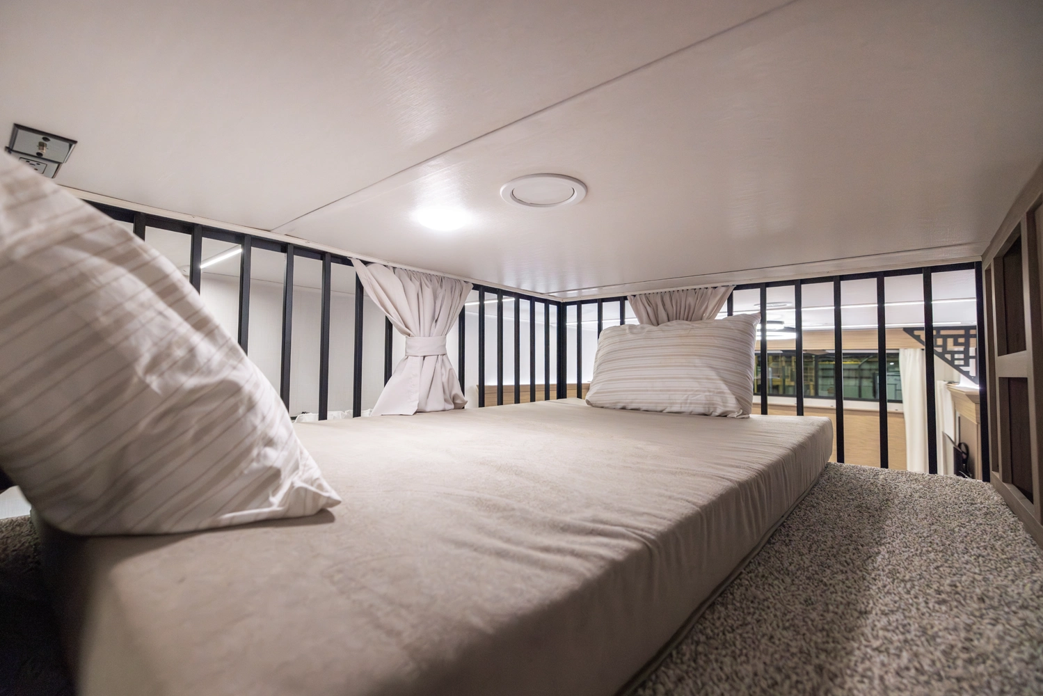 The Wildwood Grand Lodge 42DL is another fantastic double loft destination trailer. In addition to the HUGE double loft bonus room for the kids, there is a front queen bedroom for the adults, plus additional sleep options in the living room. The bathroom includes a walk-in shower with a built-in seat, while the island kitchen provides residential appliances and plenty of room for all the cooking essentials.
