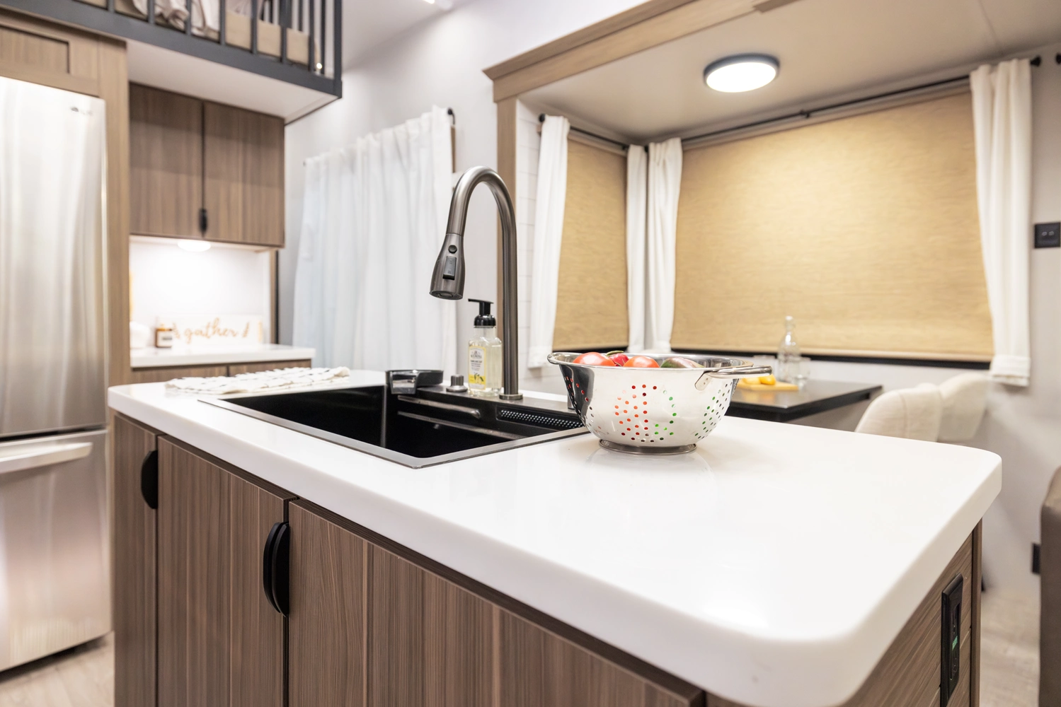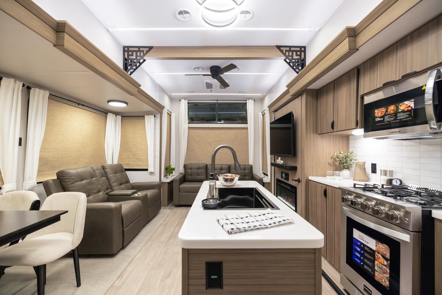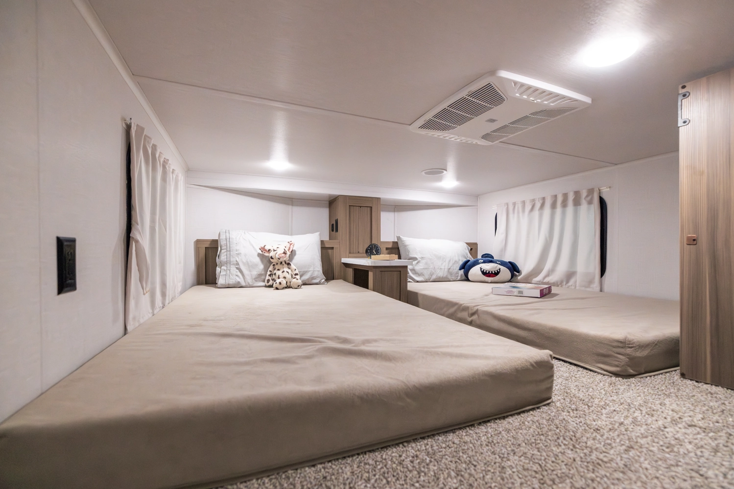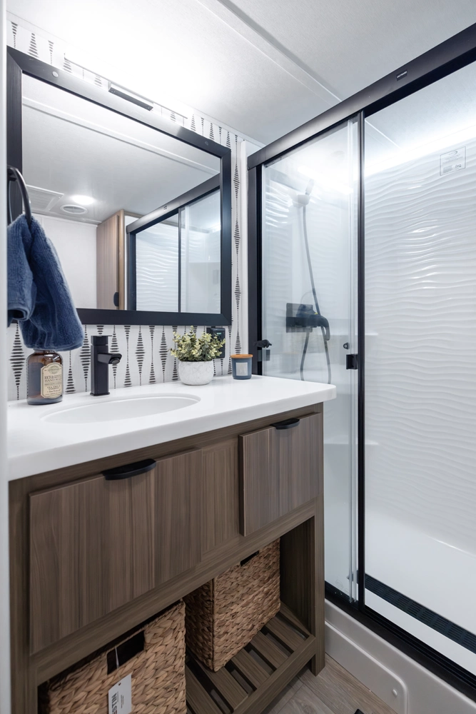 The Wildwood Grand Lodge 42DL is another fantastic double loft destination trailer. In addition to the HUGE double loft bonus room for the kids, there is a front queen bedroom for the adults, plus additional sleep options in the living room. The bathroom includes a walk-in shower with a built-in seat, while the island kitchen provides residential appliances and plenty of room for all the cooking essentials.