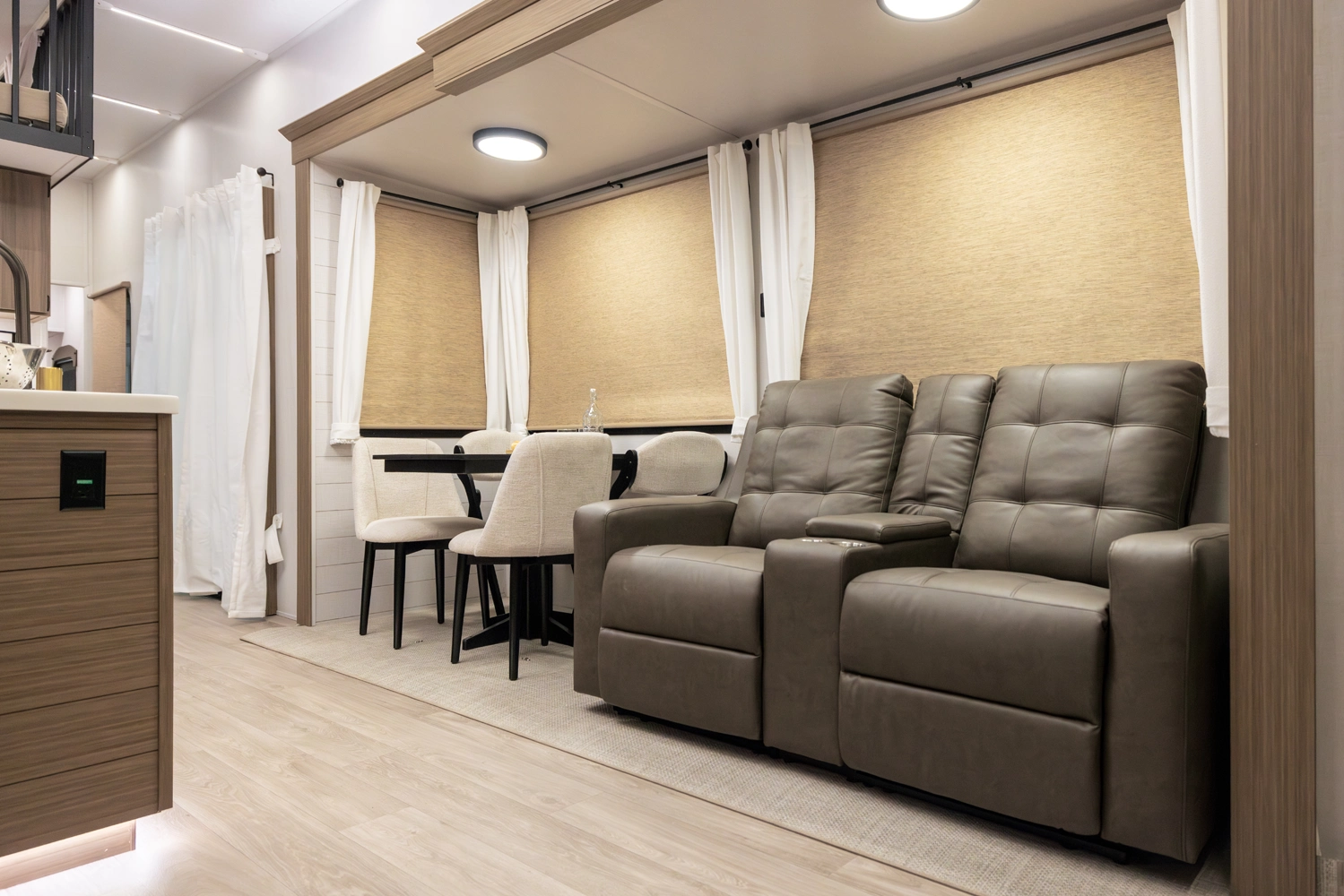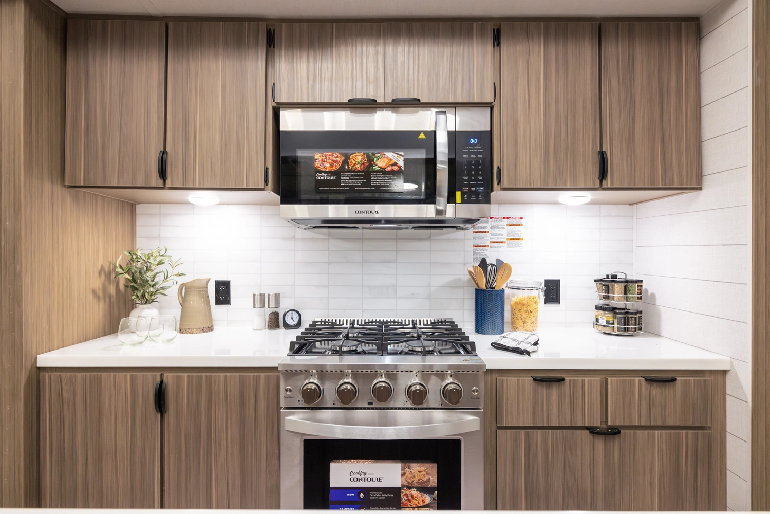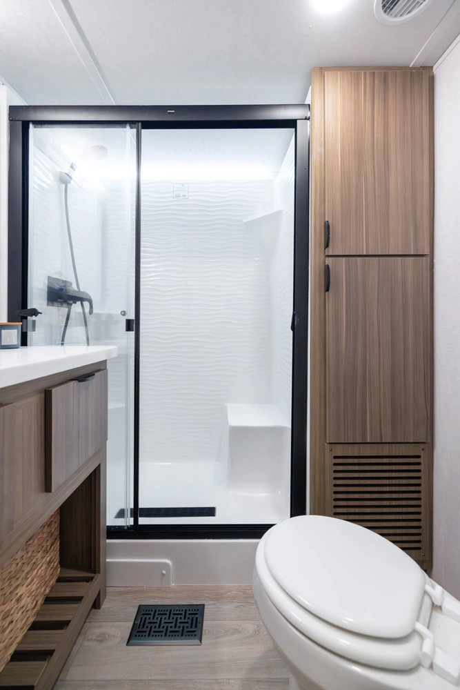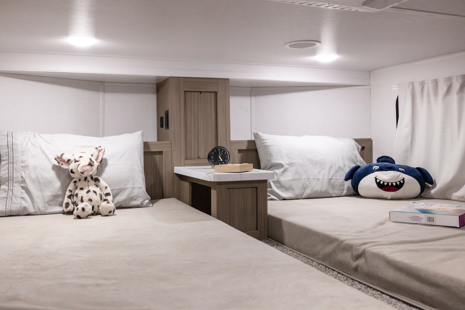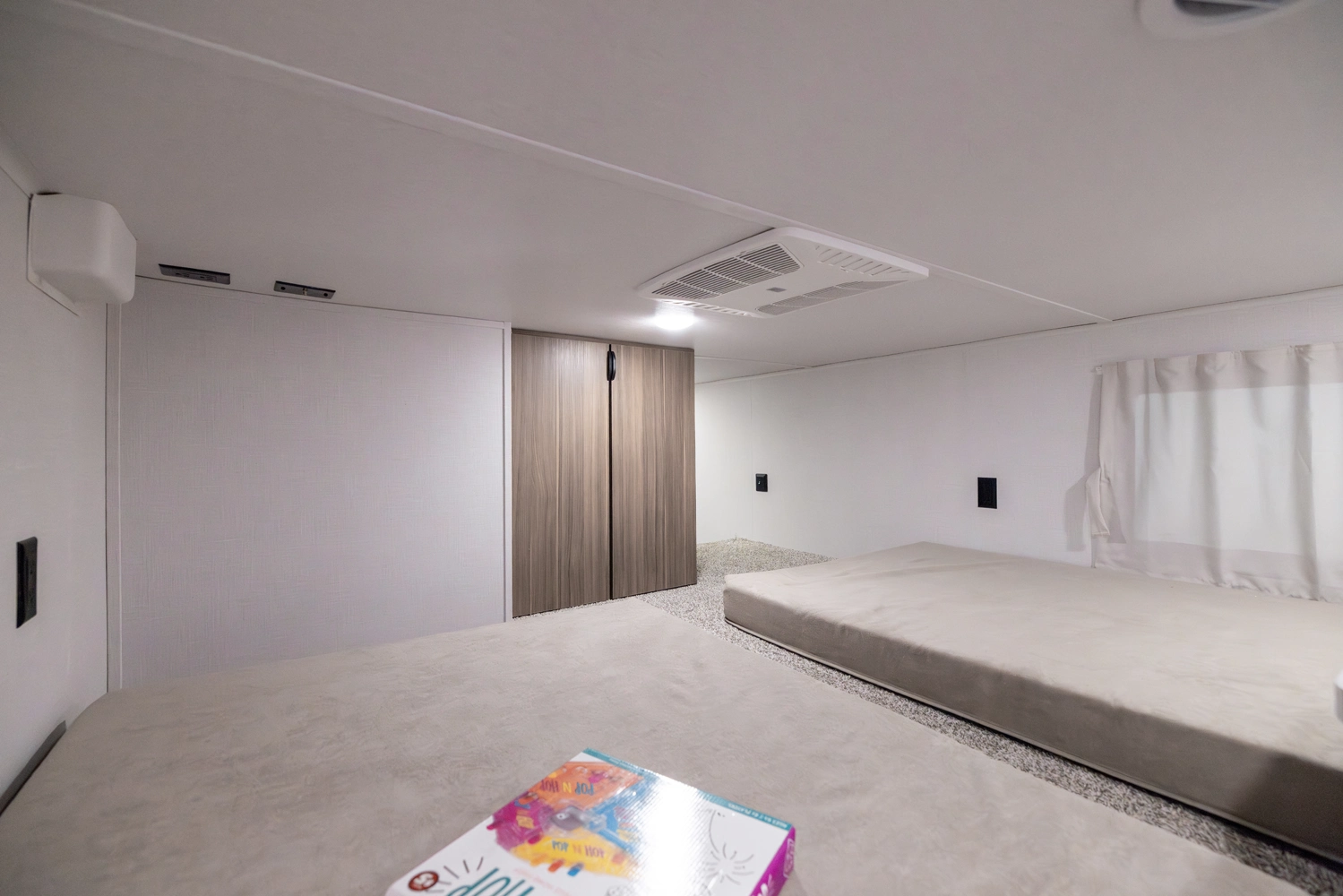 The Wildwood Grand Lodge 42DL is another fantastic double loft destination trailer. In addition to the HUGE double loft bonus room for the kids, there is a front queen bedroom for the adults, plus additional sleep options in the living room. The bathroom includes a walk-in shower with a built-in seat, while the island kitchen provides residential appliances and plenty of room for all the cooking essentials.