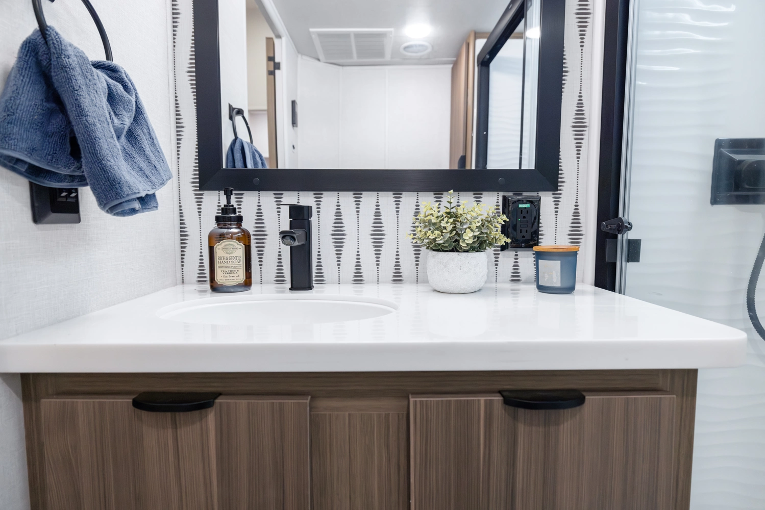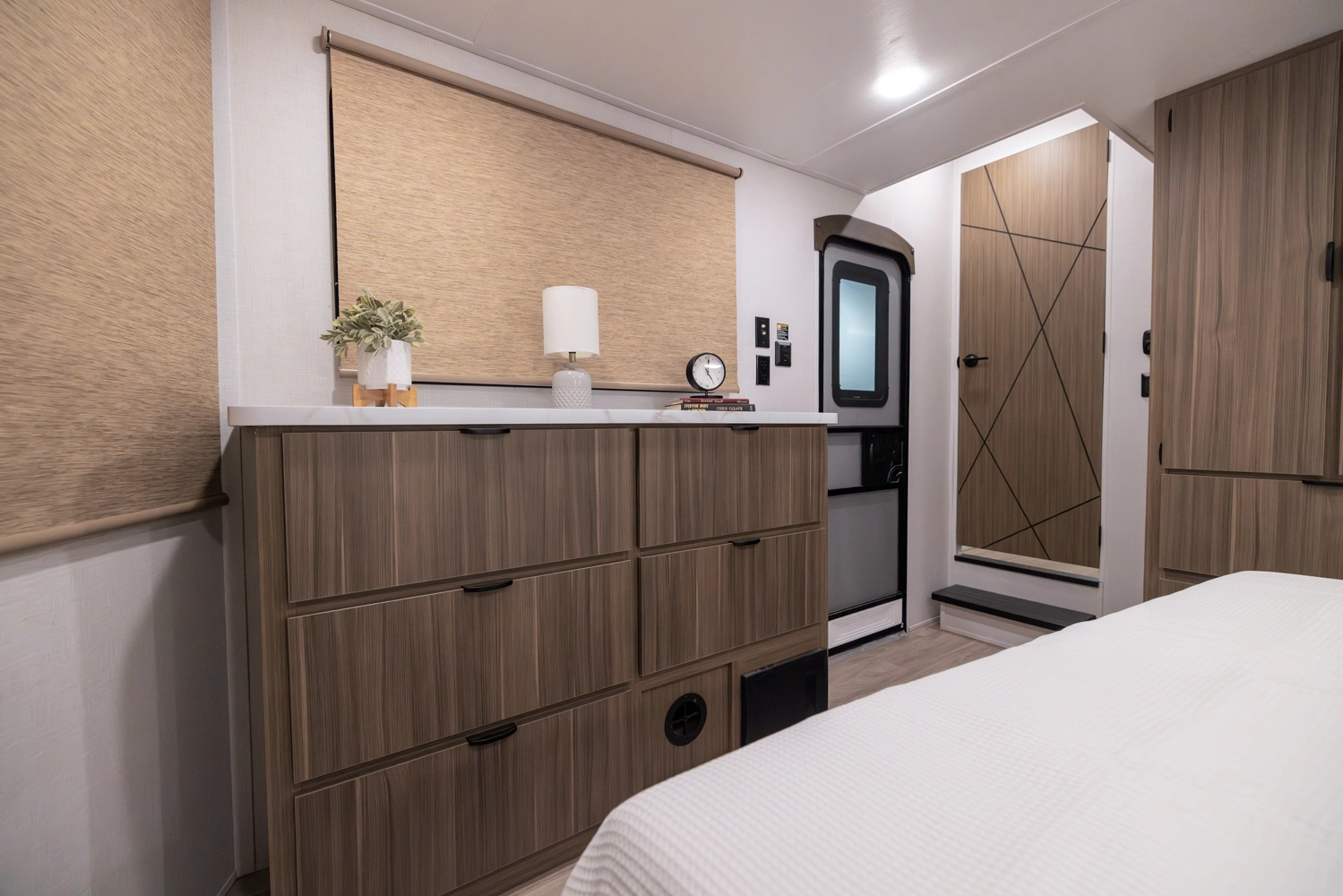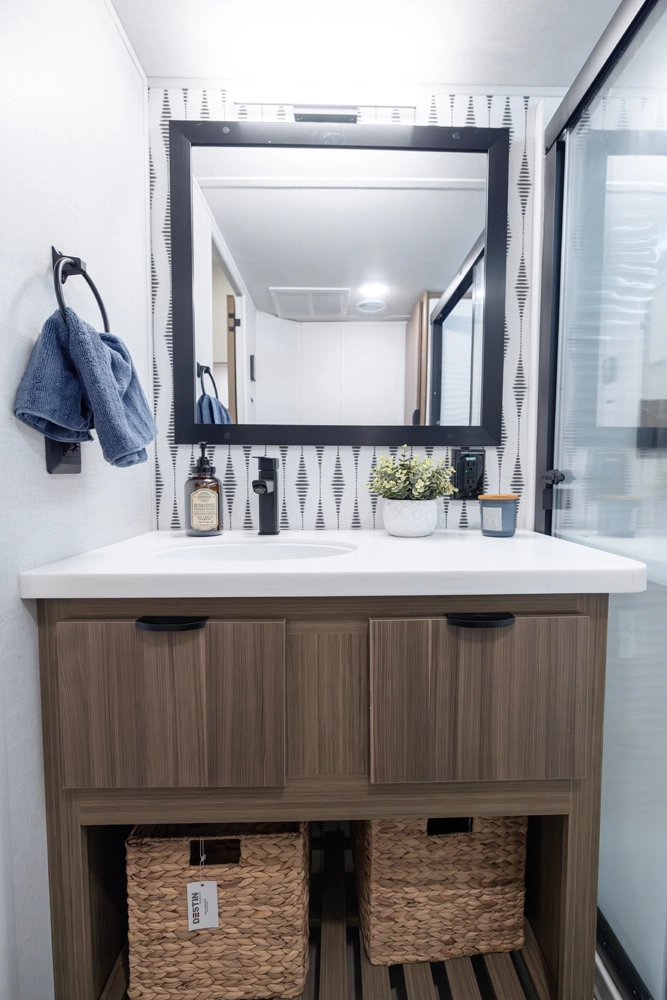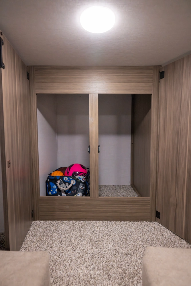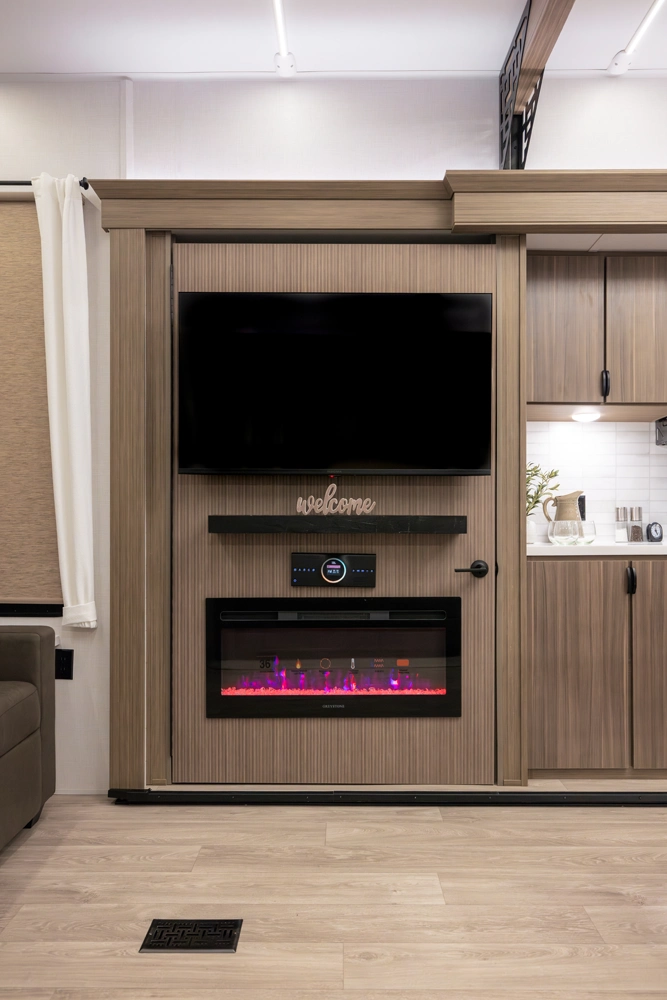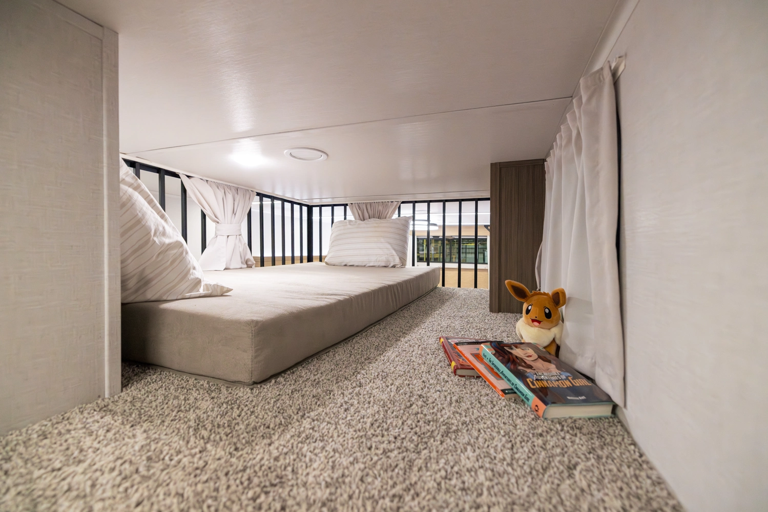 The Wildwood Grand Lodge 42DL is another fantastic double loft destination trailer. In addition to the HUGE double loft bonus room for the kids, there is a front queen bedroom for the adults, plus additional sleep options in the living room. The bathroom includes a walk-in shower with a built-in seat, while the island kitchen provides residential appliances and plenty of room for all the cooking essentials.