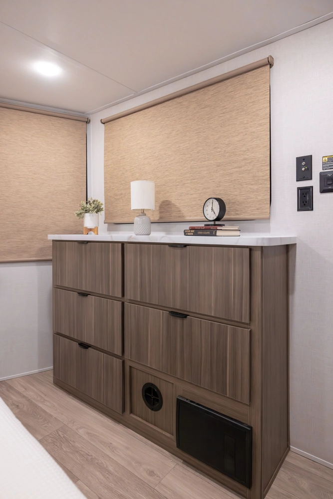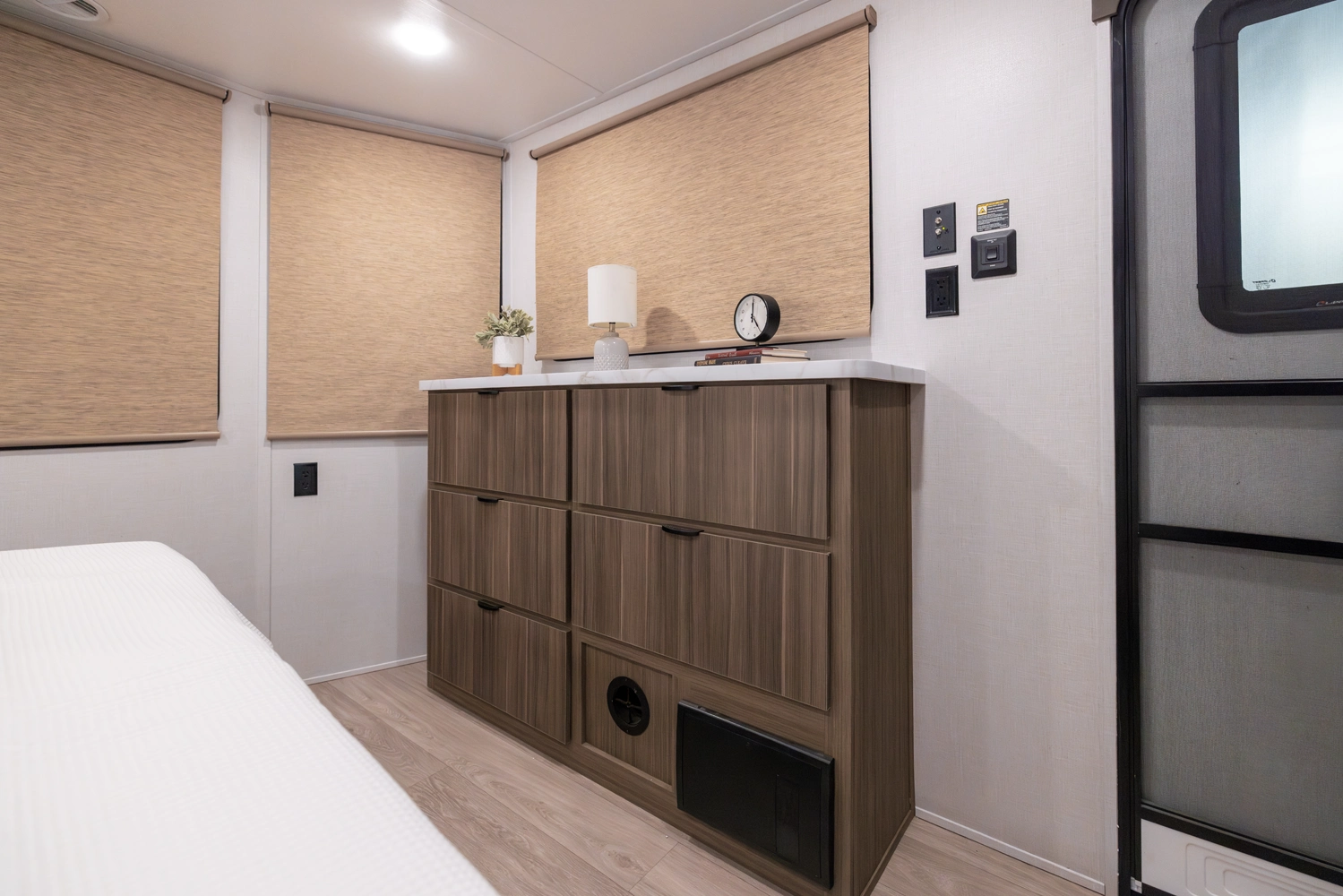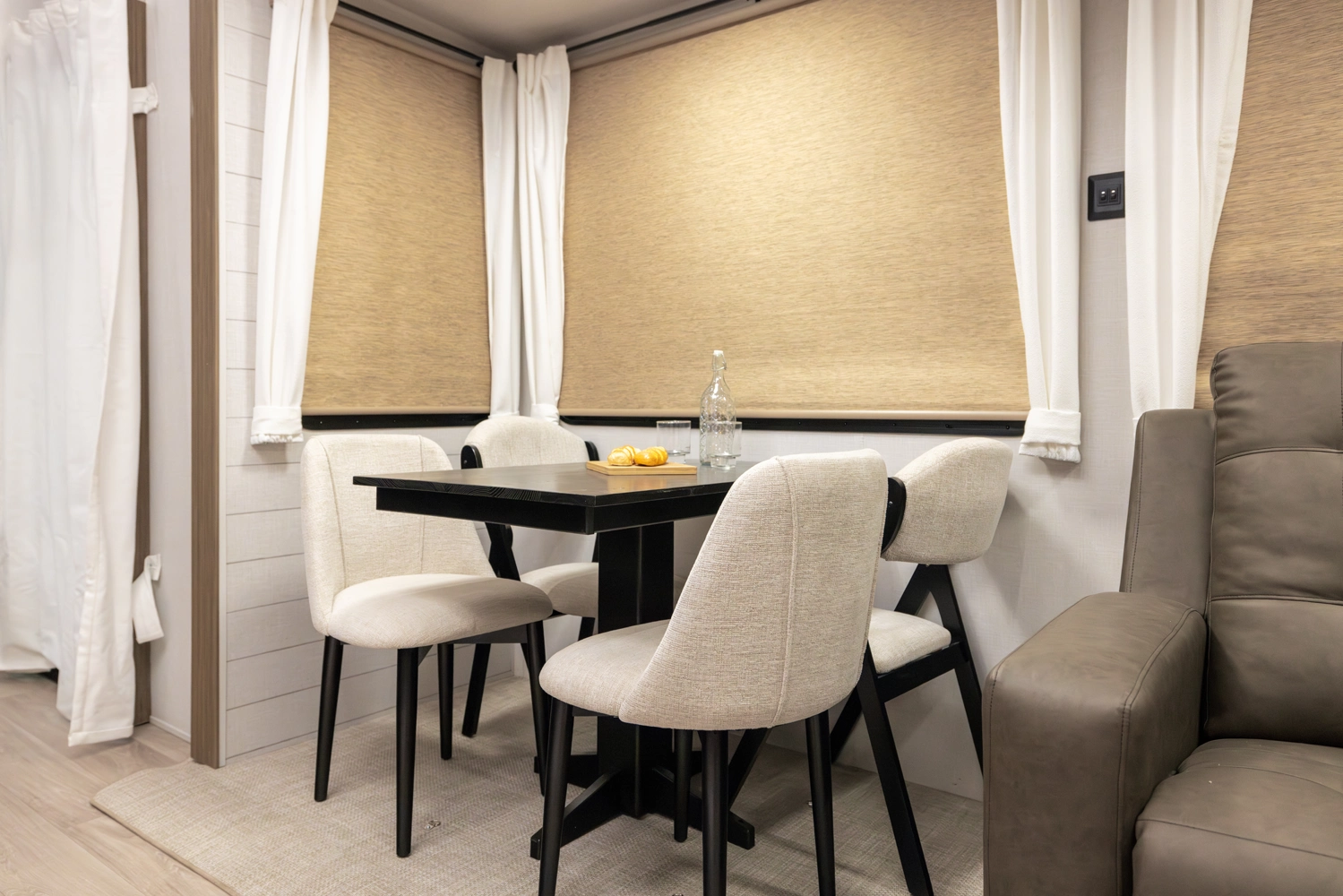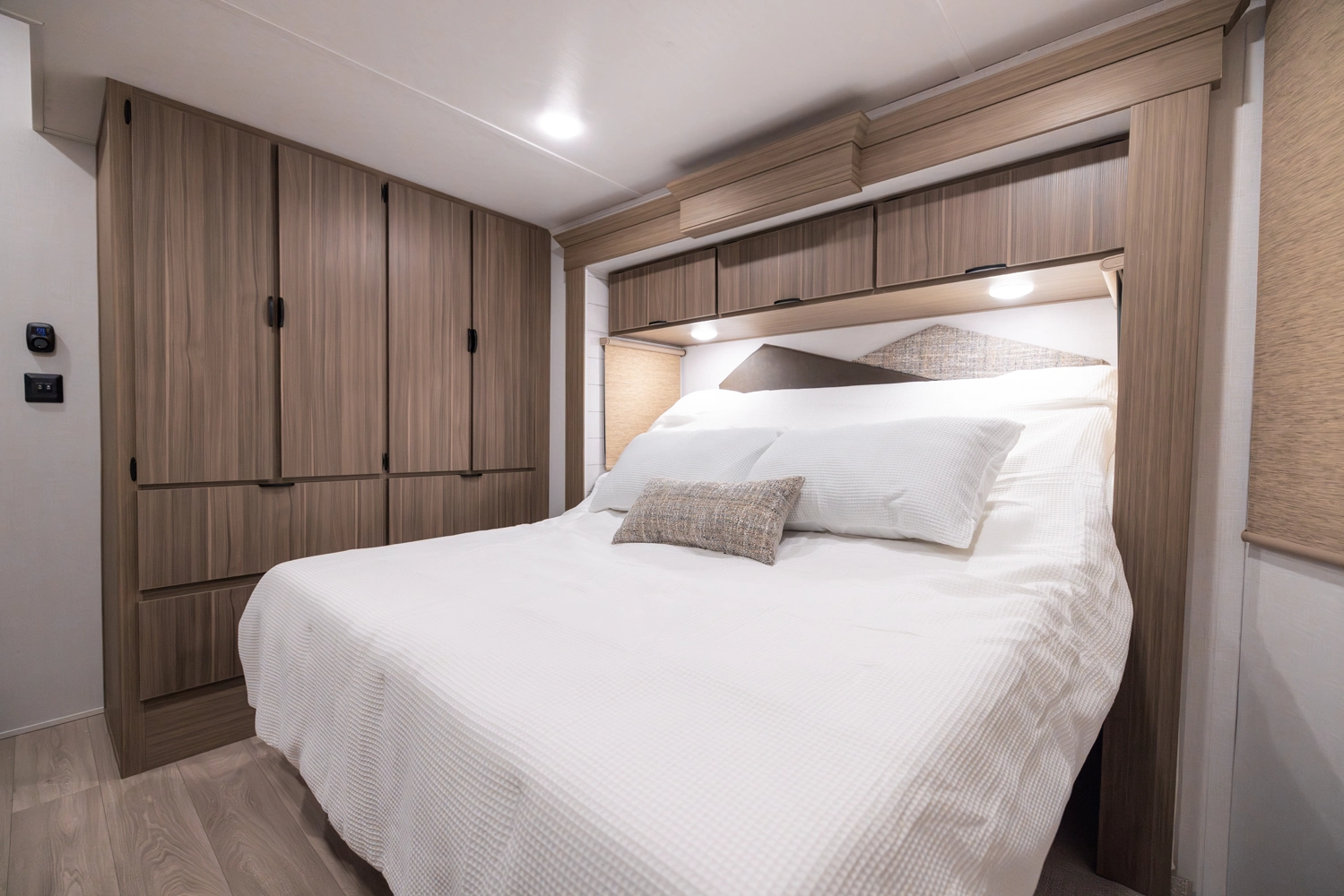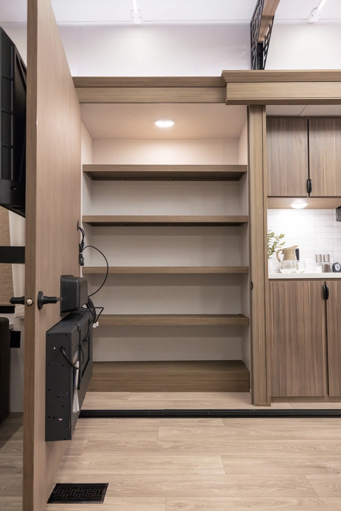 The Wildwood Grand Lodge 42DL is another fantastic double loft destination trailer. In addition to the HUGE double loft bonus room for the kids, there is a front queen bedroom for the adults, plus additional sleep options in the living room. The bathroom includes a walk-in shower with a built-in seat, while the island kitchen provides residential appliances and plenty of room for all the cooking essentials.