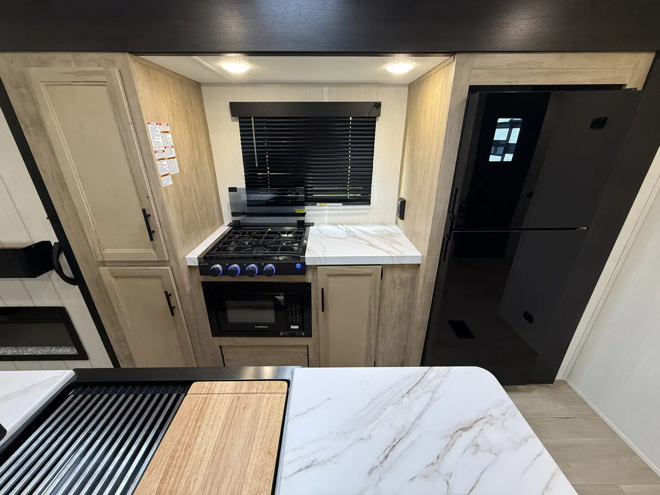 • Cherokee Black Label Wolf Den (Deep Tinted Frameless Automotive Glass Windows, High Gloss Gel Coat Exterior Sidewalls, Multicolor Reading Lights, Pillowtop Mattress Upgrade, Solid Surface Countertops, Thermo Foil Arctic Insulation)